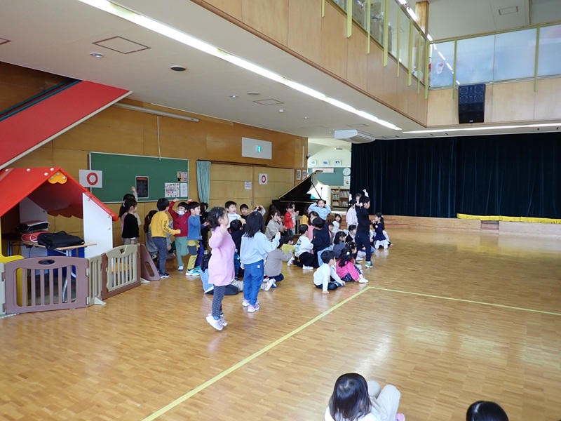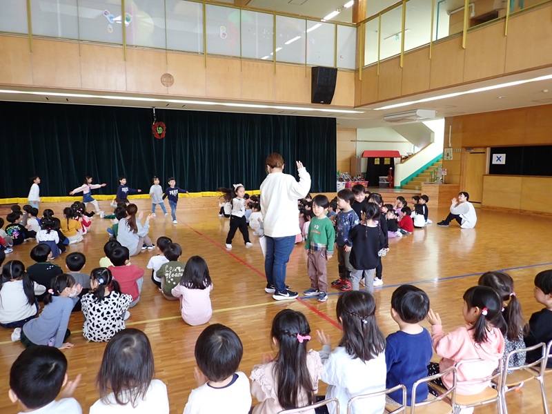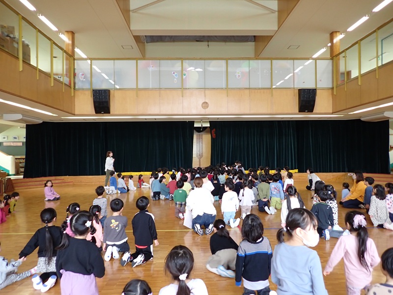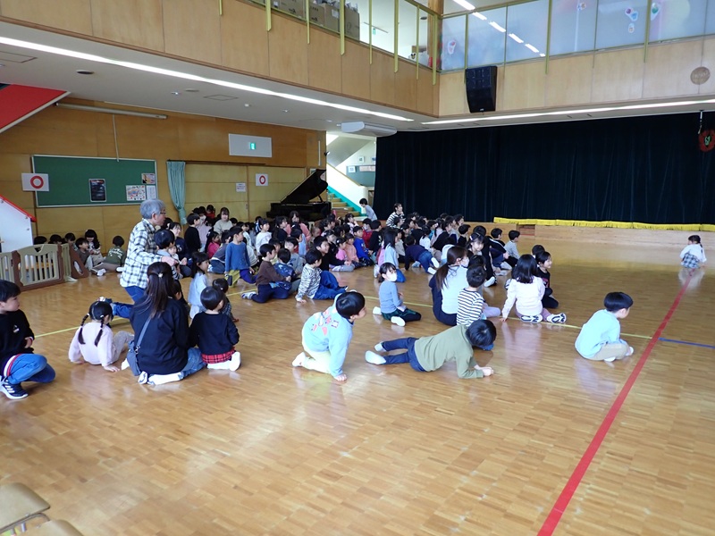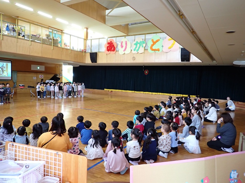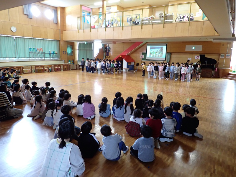 本日は、年長組さんとのお別れ会でした。「よろこびのうた♪」にのって、年長組さんが入場しました。