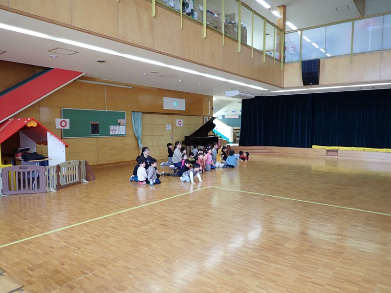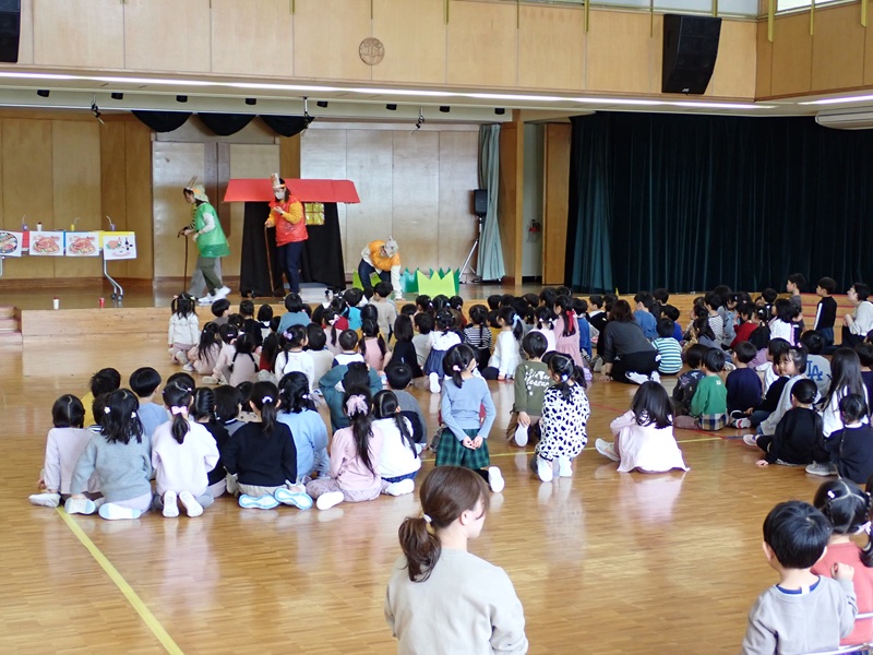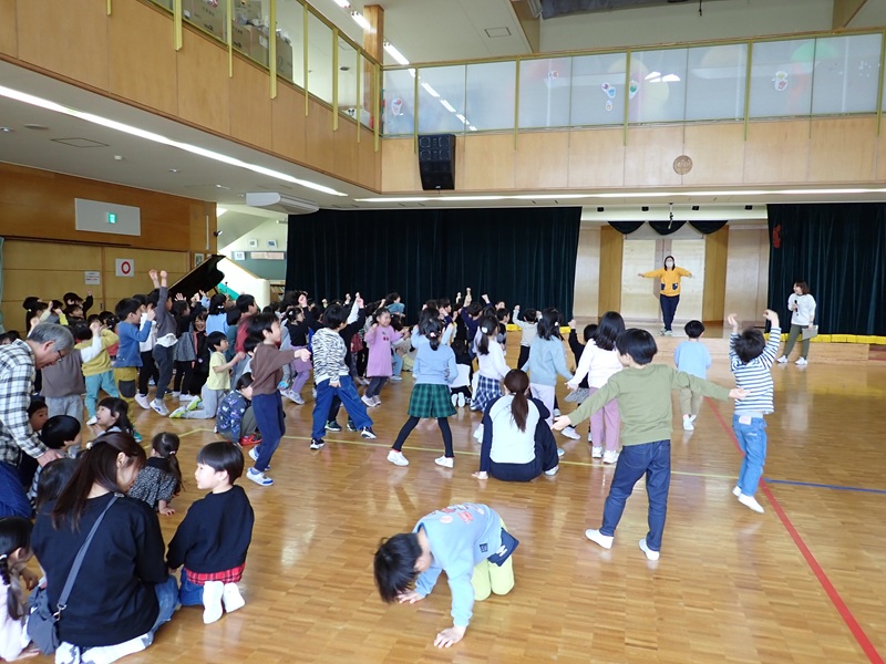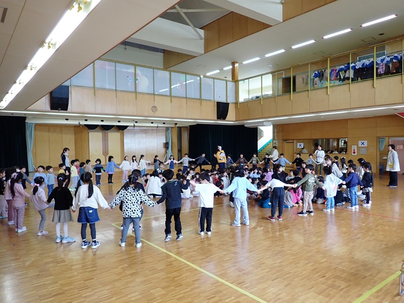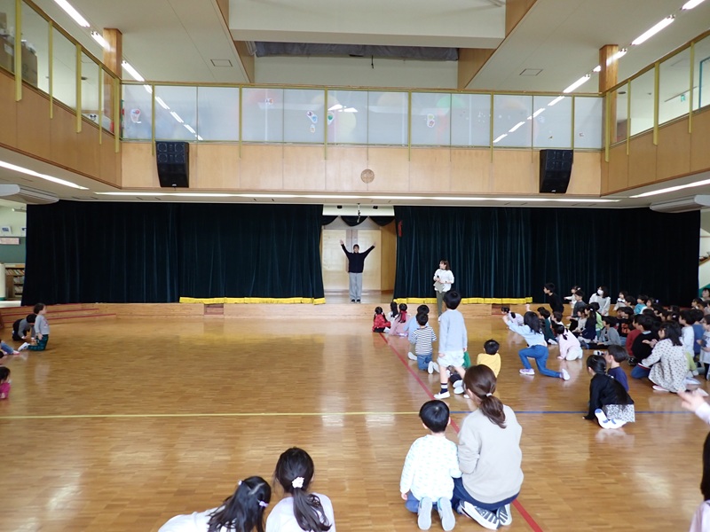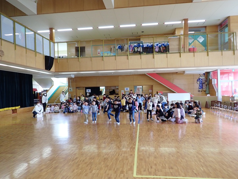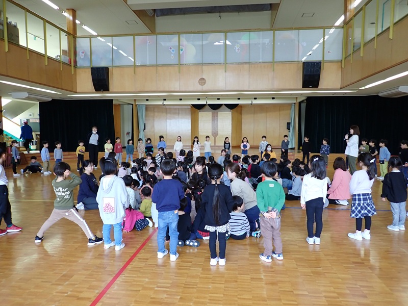 本日は、年長組さんとのお別れ会でした。「よろこびのうた♪」にのって、年長組さんが入場しました。