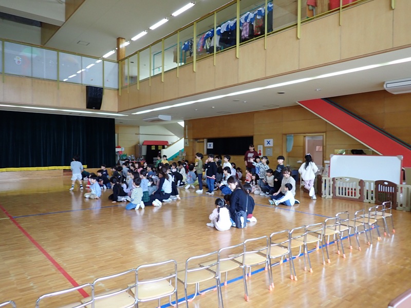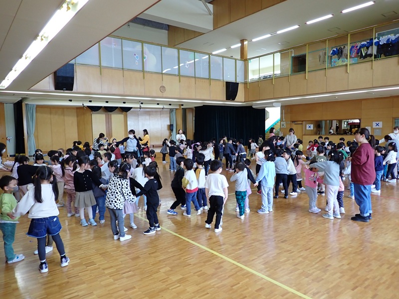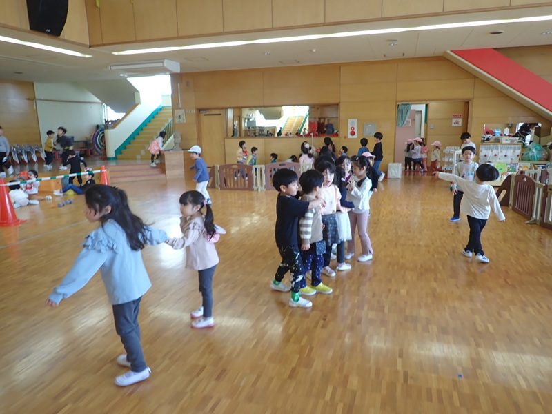 ①ゲーム1 ふれあい遊び…年長組さんが年中少組さんともも組さんを輪で囲み、音楽が止まったら年長組さん1人と他の2人が3人でコンビになって、いろいろな遊びをしました。