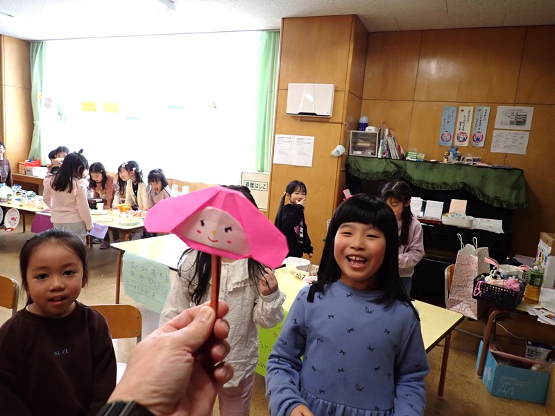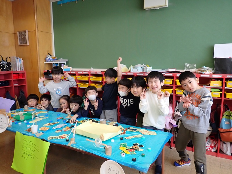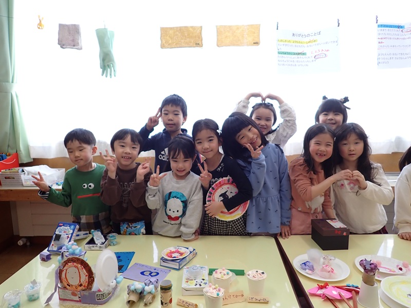 ⑦あじさい組さんは、教室でいろいろなお店をオープンしていました。写真を撮った後、たんぽぽ組さんがお客さんとしてやって来ました。
