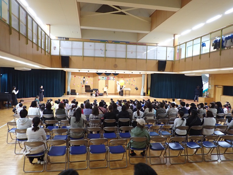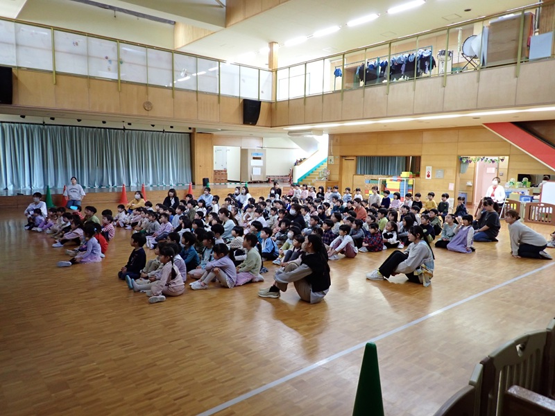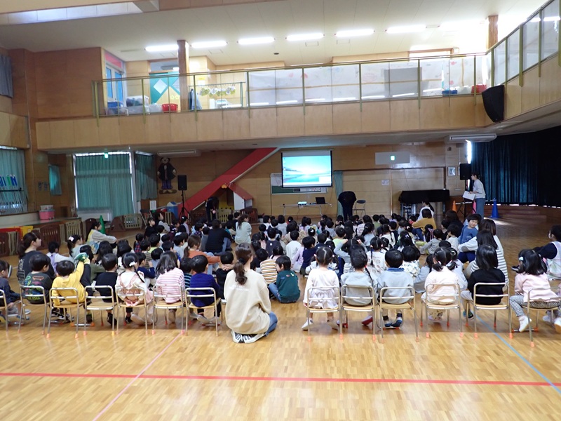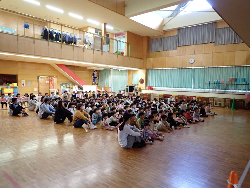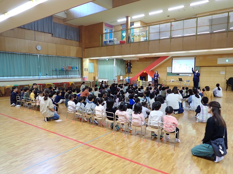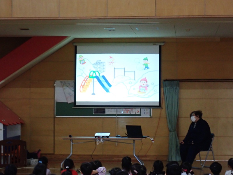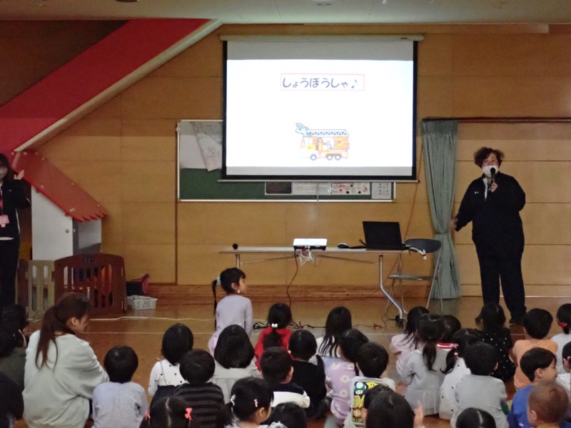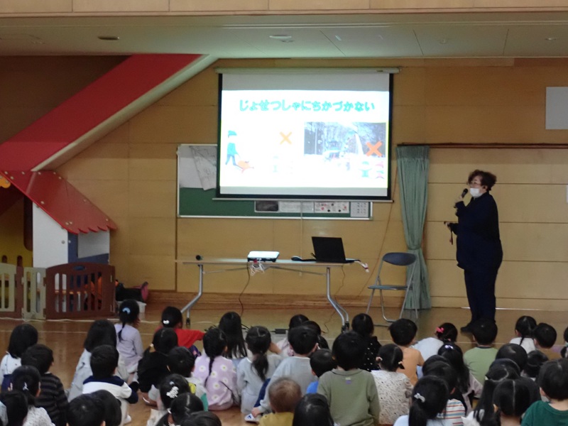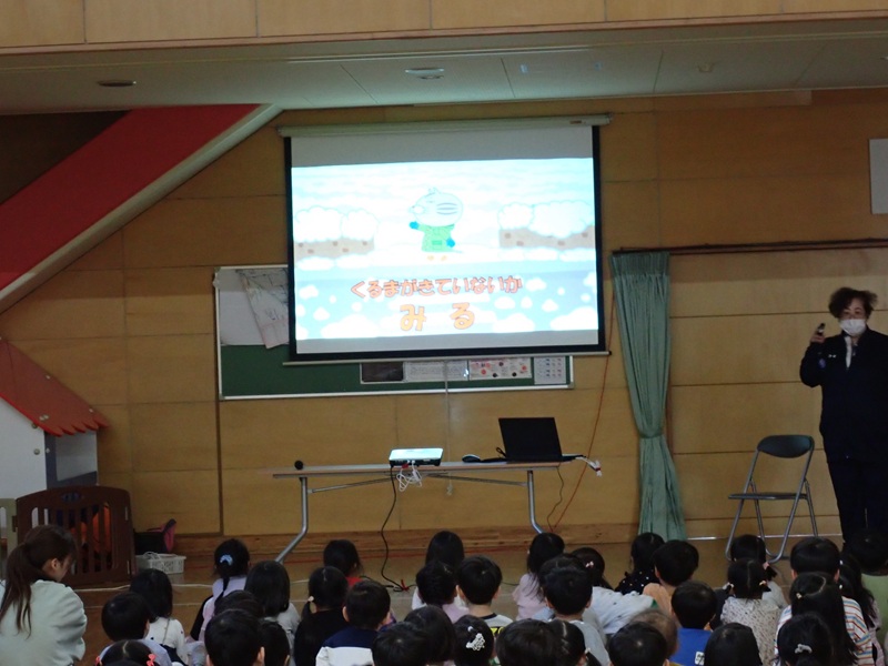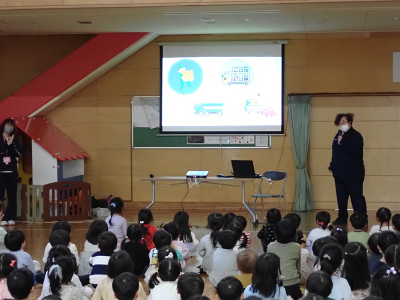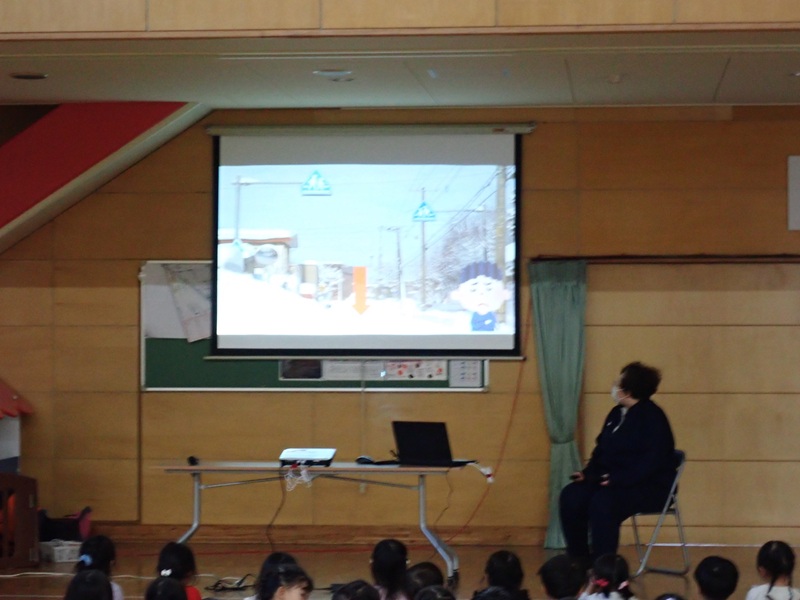 本日は、札幌市東区交通安全推進委員会の方々に来ていただいて、夏に続いての第2弾として「冬の交通安全教室」を実施していただきました。まずは働く車のテーマソングで盛り上がりました。