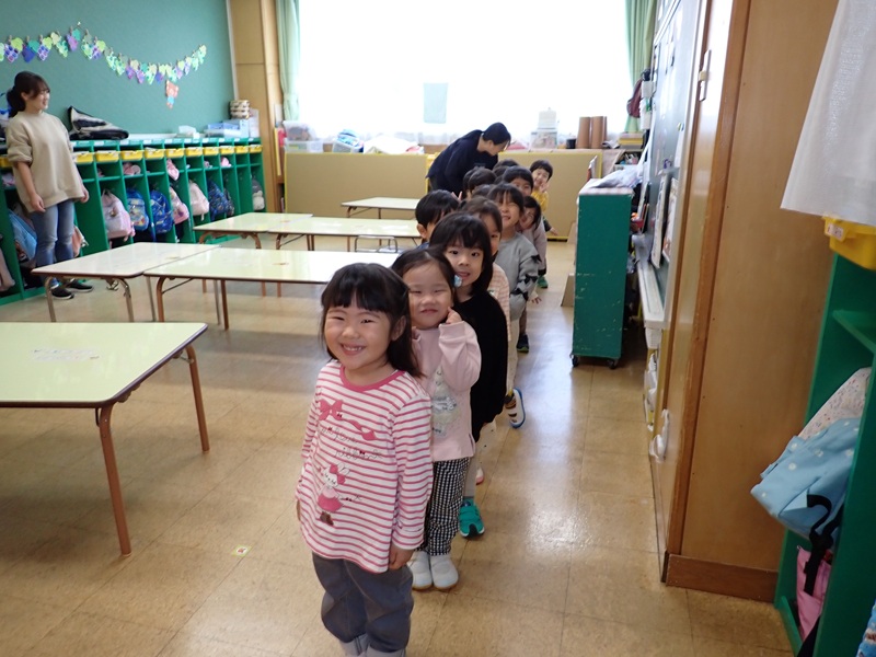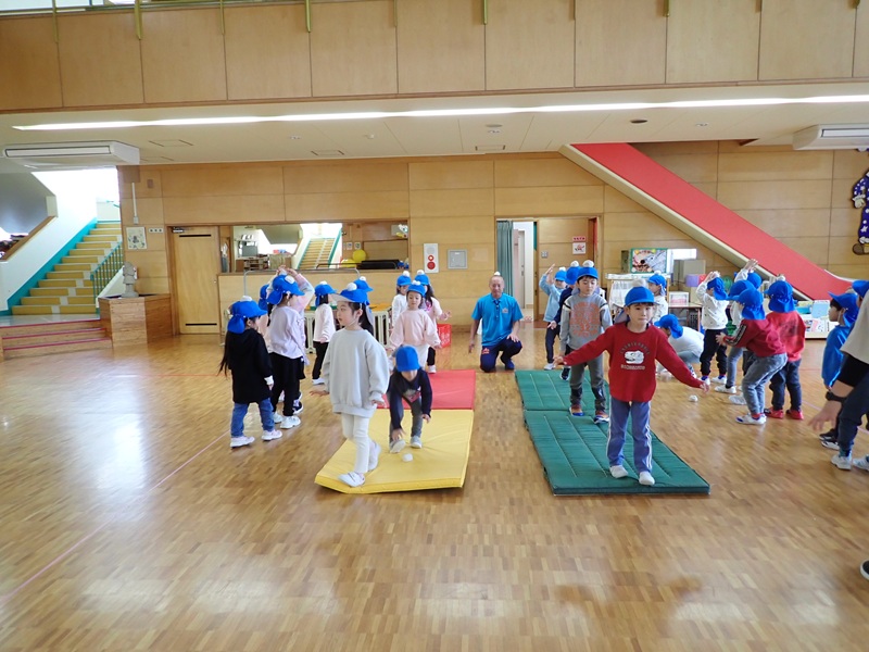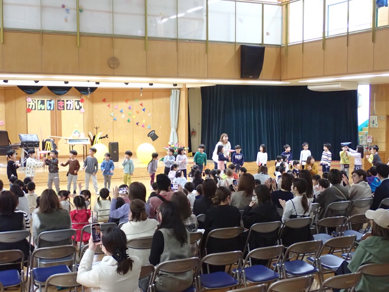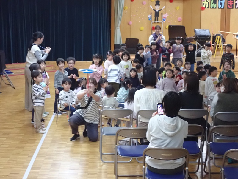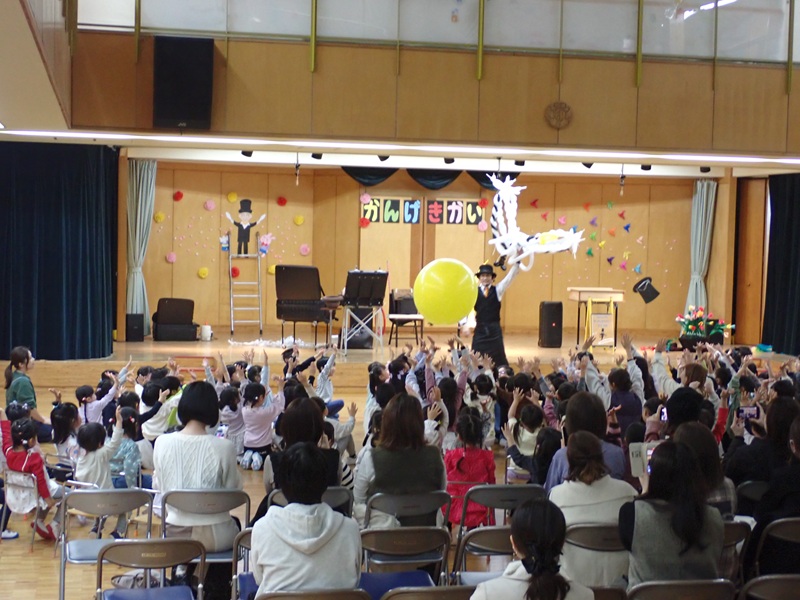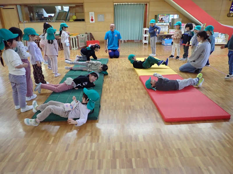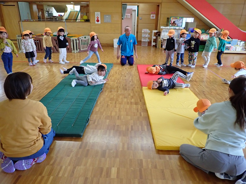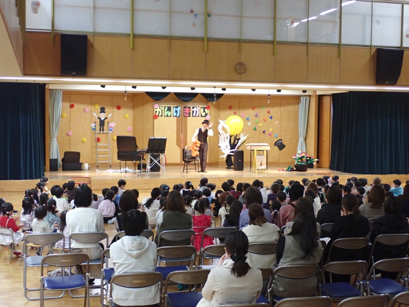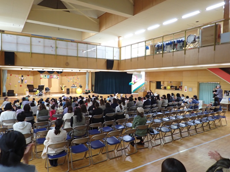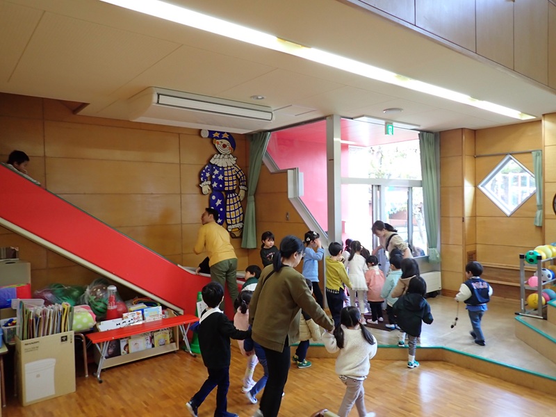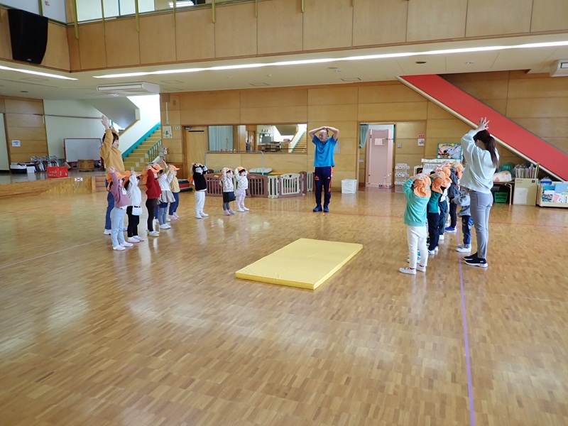 本日は、札幌市東区交通安全推進委員会の方々に来ていただいて、夏に続いての第2弾として「冬の交通安全教室」を実施していただきました。まずは働く車のテーマソングで盛り上がりました。