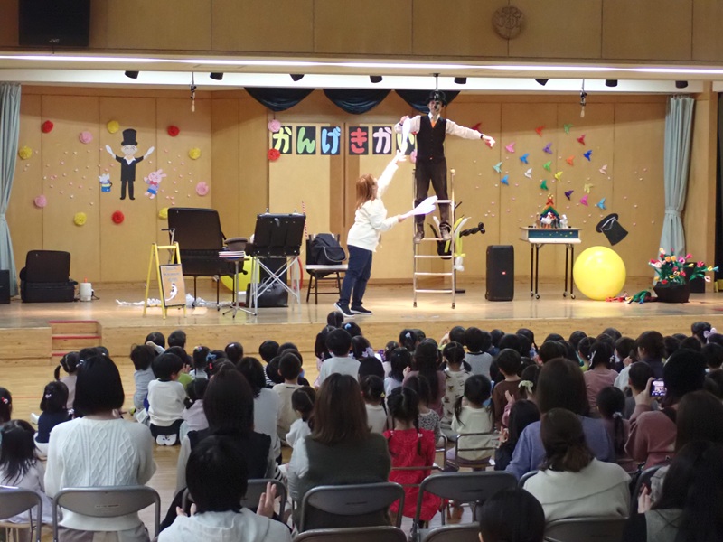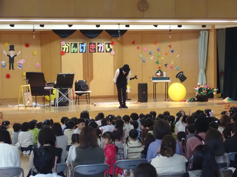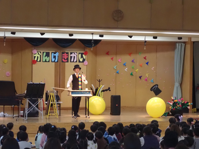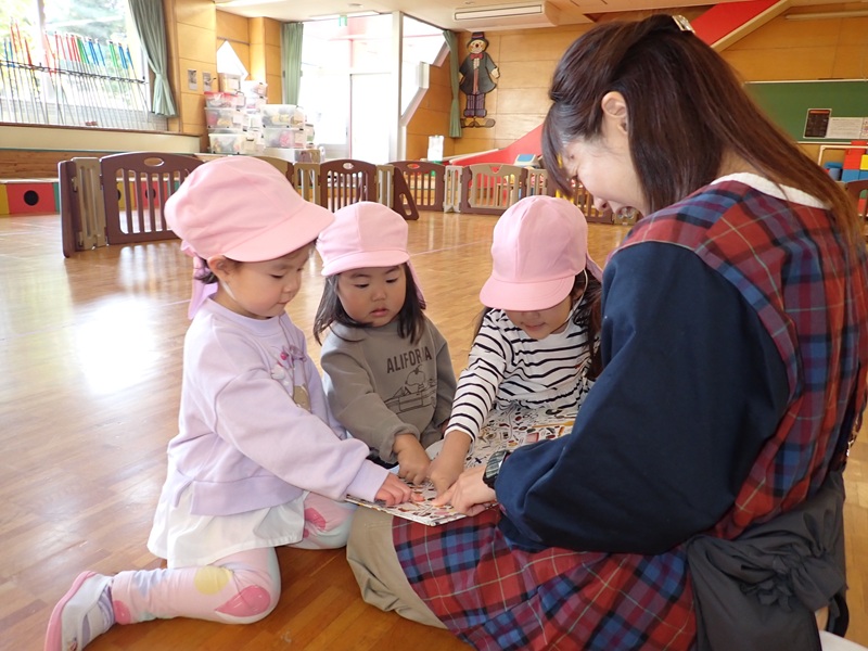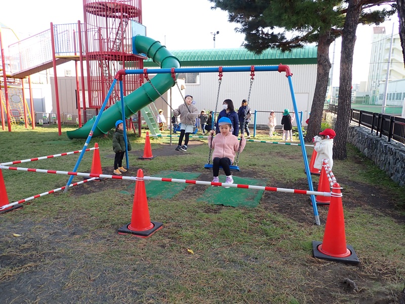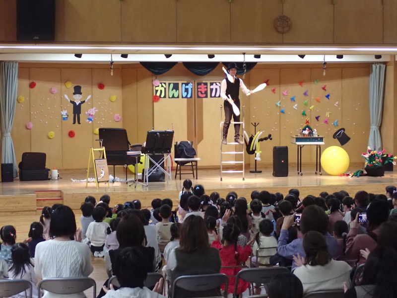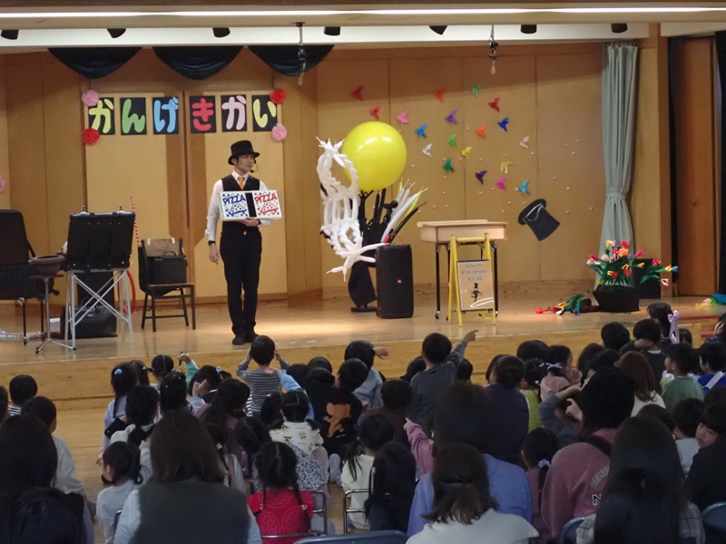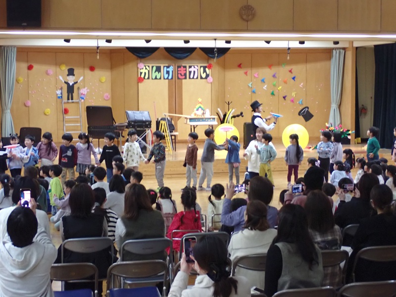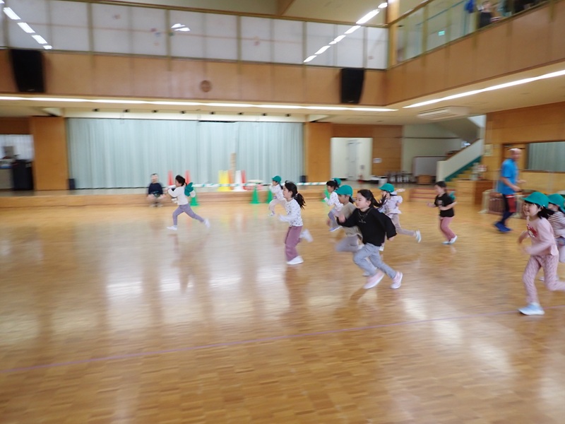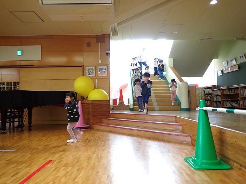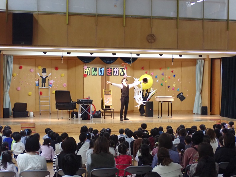 本日は、札幌市東区交通安全推進委員会の方々に来ていただいて、夏に続いての第2弾として「冬の交通安全教室」を実施していただきました。まずは働く車のテーマソングで盛り上がりました。