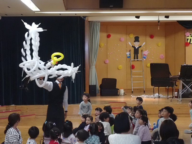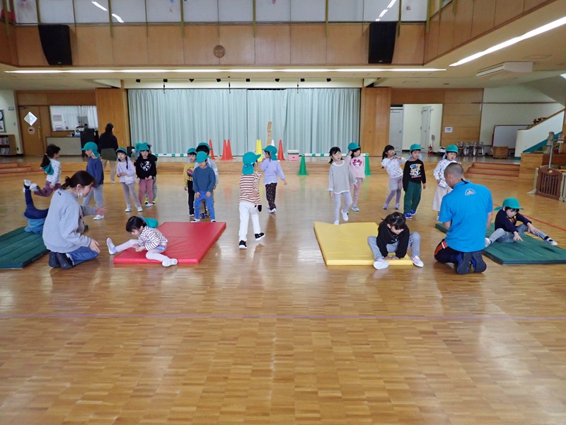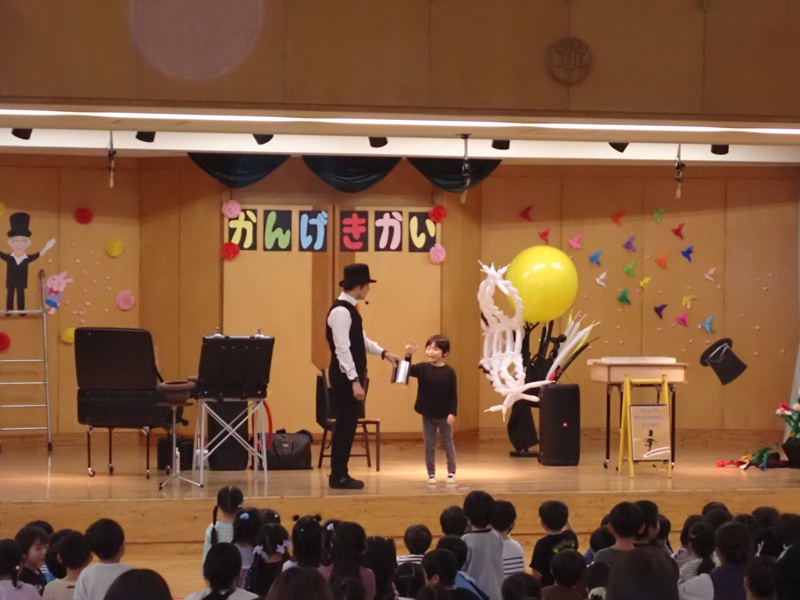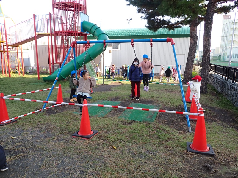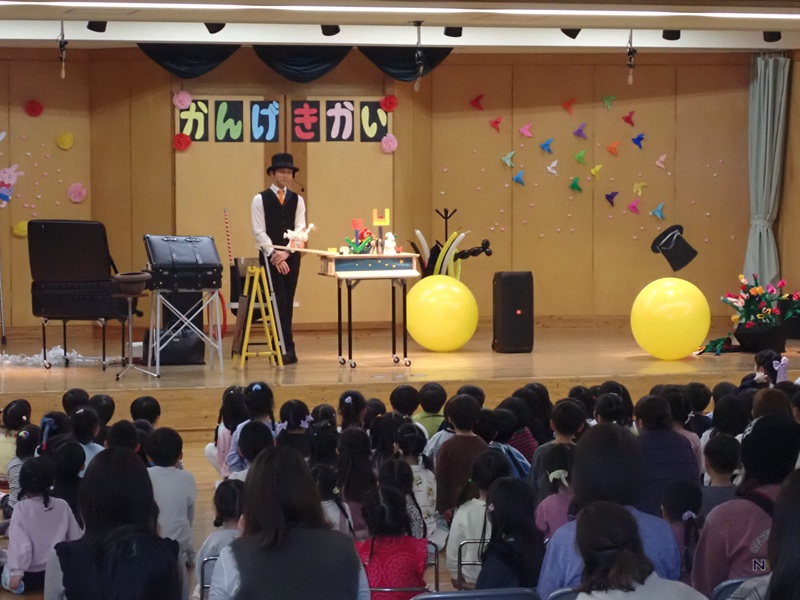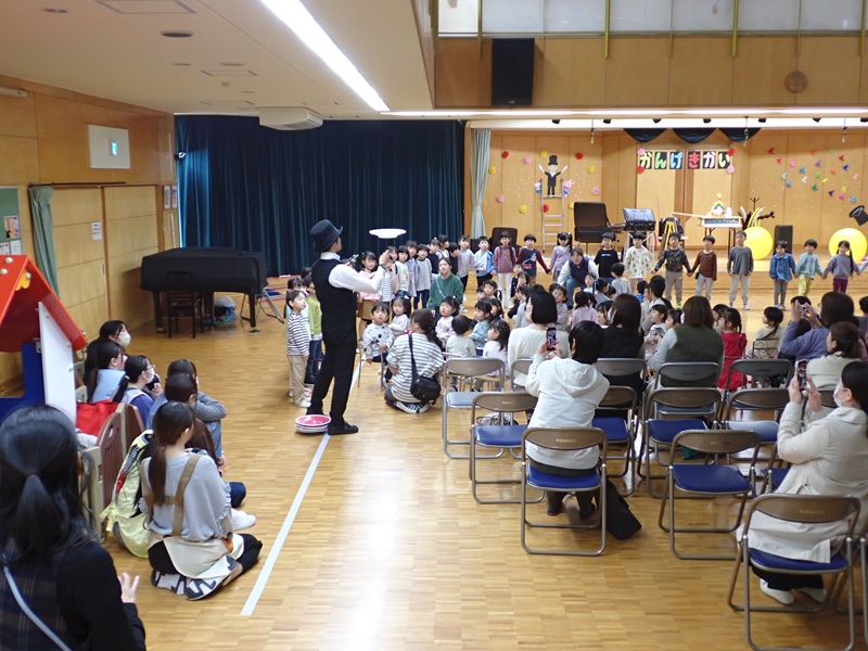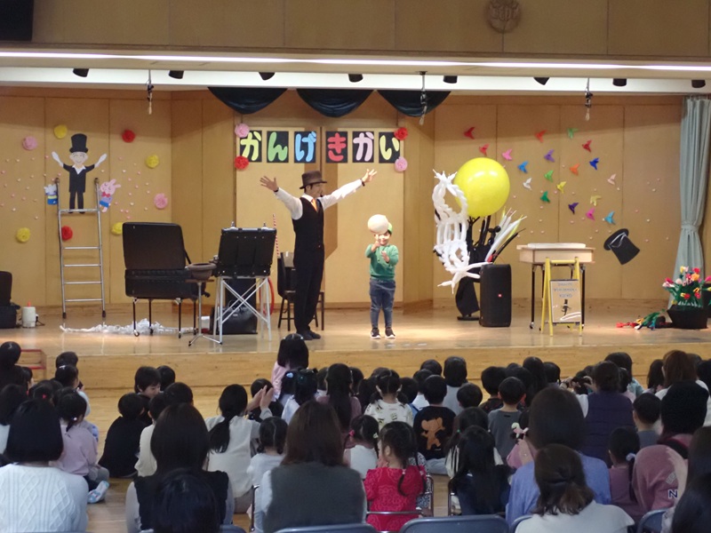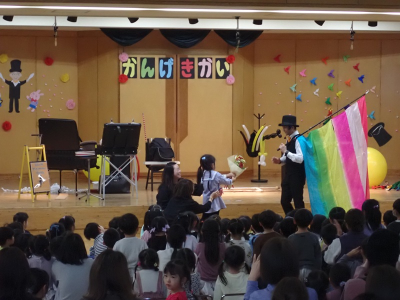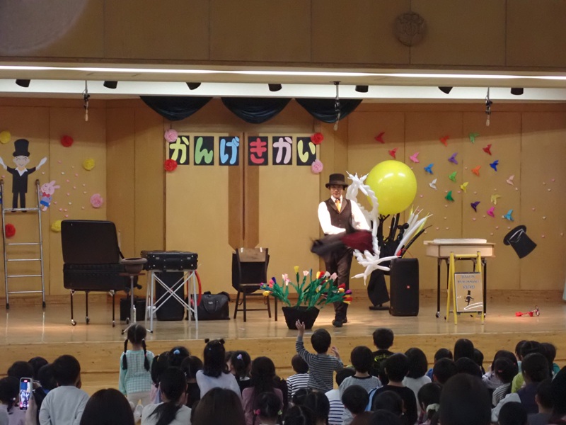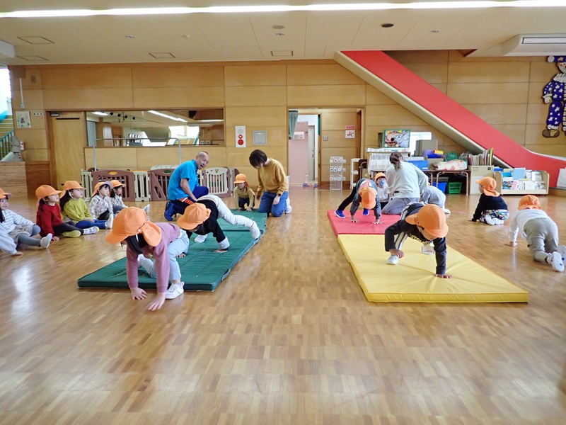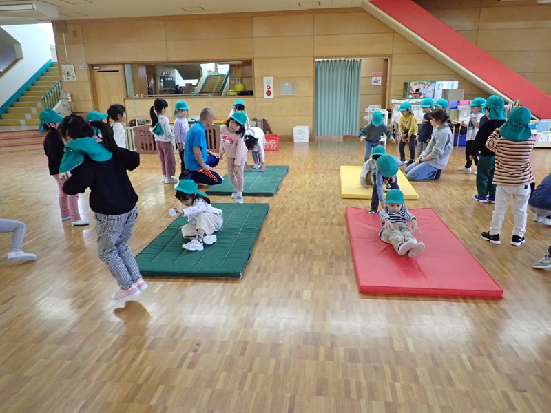 本日は、札幌市東区交通安全推進委員会の方々に来ていただいて、夏に続いての第2弾として「冬の交通安全教室」を実施していただきました。まずは働く車のテーマソングで盛り上がりました。
