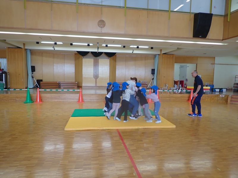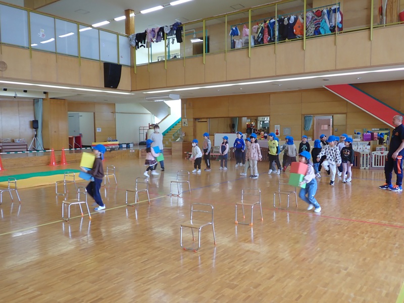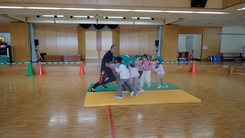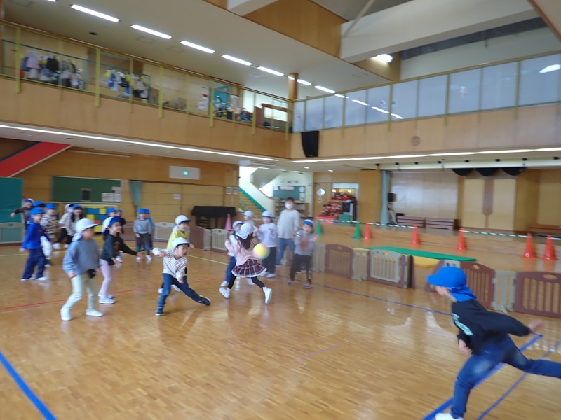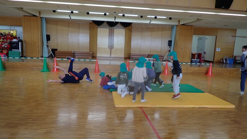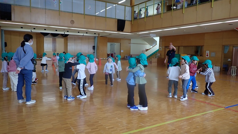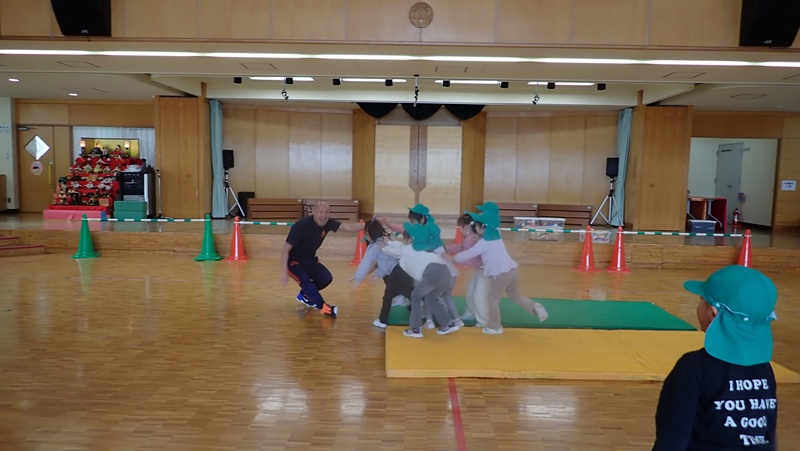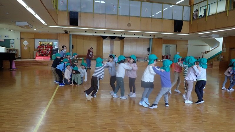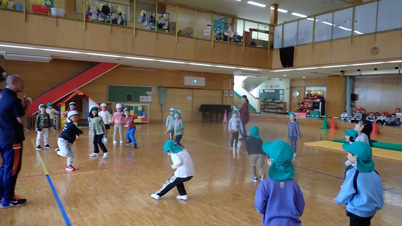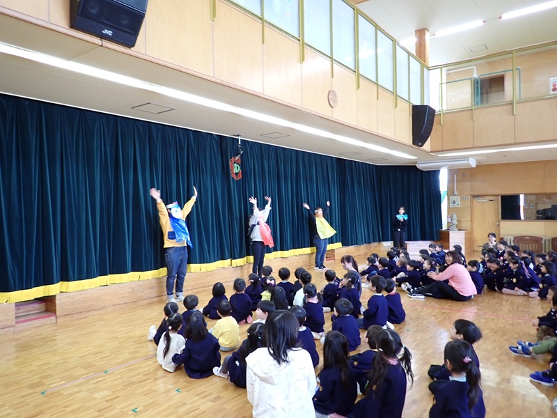 ④ここから先生たちの見せ場となりました。まずは、アンパンマン、カレーパンマン、コキンちゃんに扮した先生たちが登場!! アンパンマンの歌に合わせて踊りました。アンパンマン、カレーパンマン、コキンちゃんは、誰なのかクイズも盛り上がりました!!!