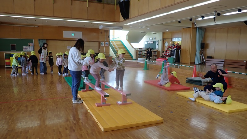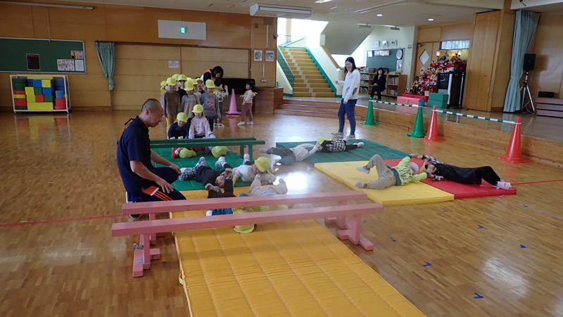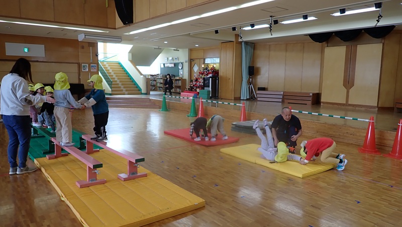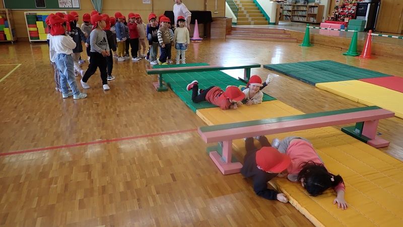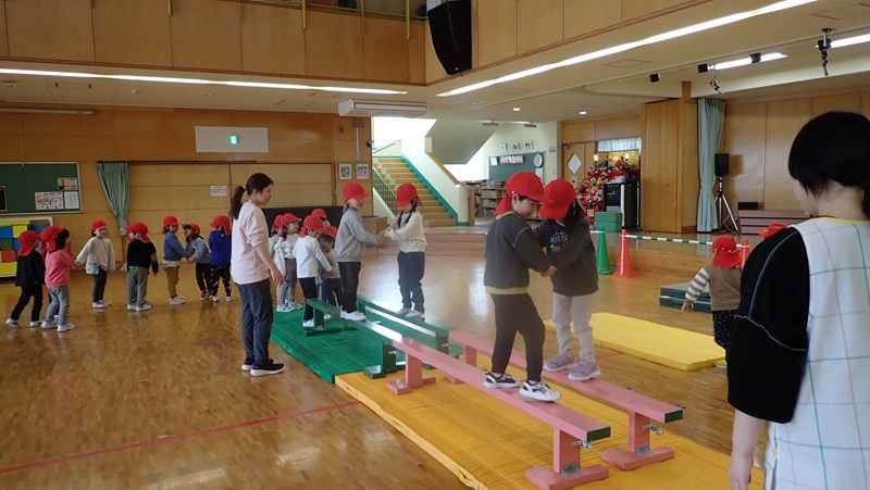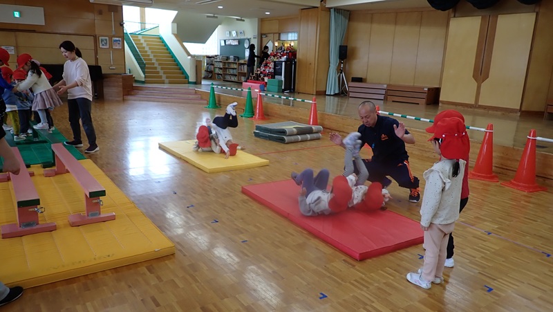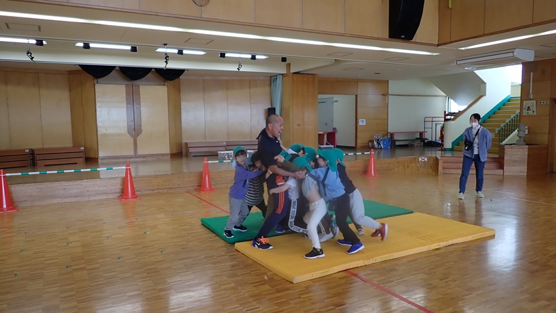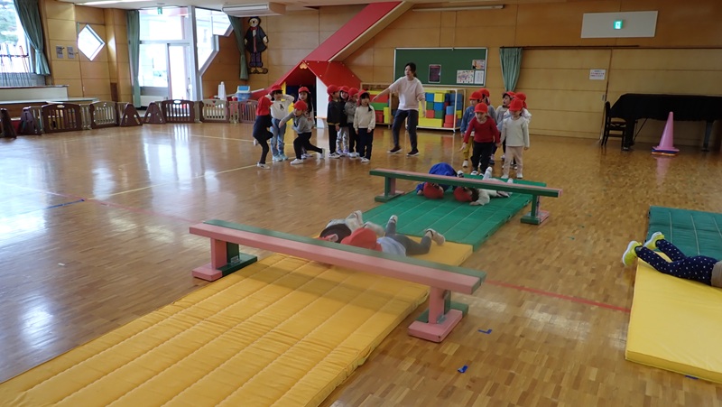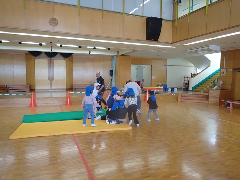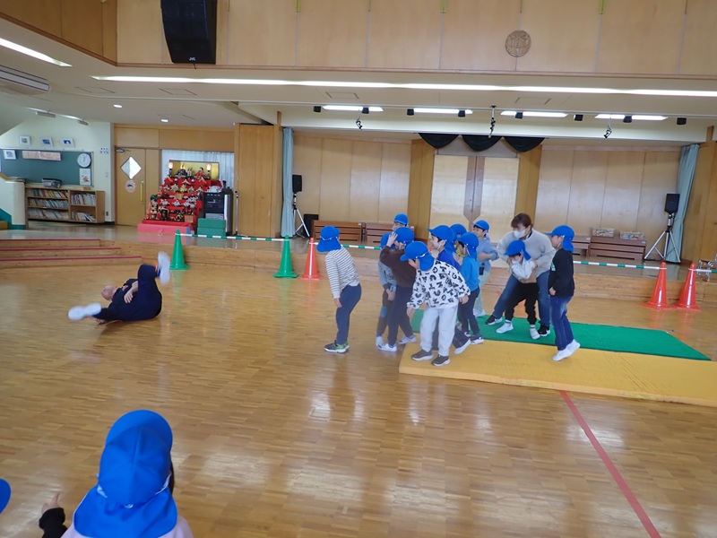 ④ここから先生たちの見せ場となりました。まずは、アンパンマン、カレーパンマン、コキンちゃんに扮した先生たちが登場!! アンパンマンの歌に合わせて踊りました。アンパンマン、カレーパンマン、コキンちゃんは、誰なのかクイズも盛り上がりました!!!