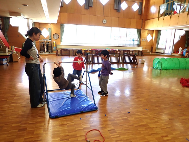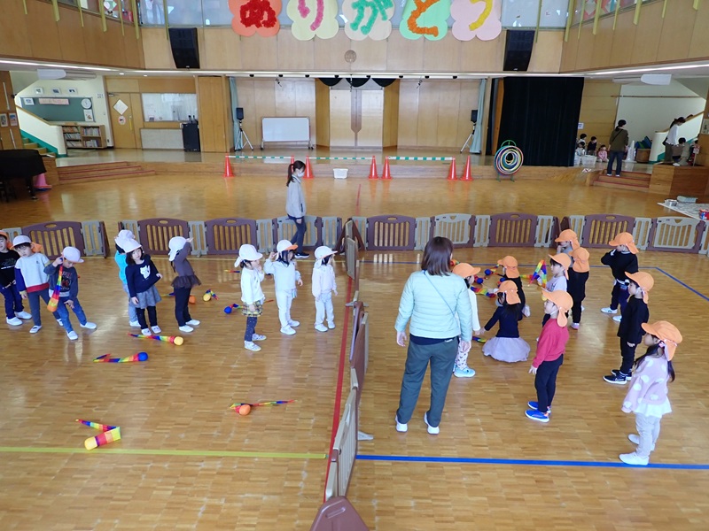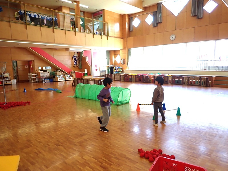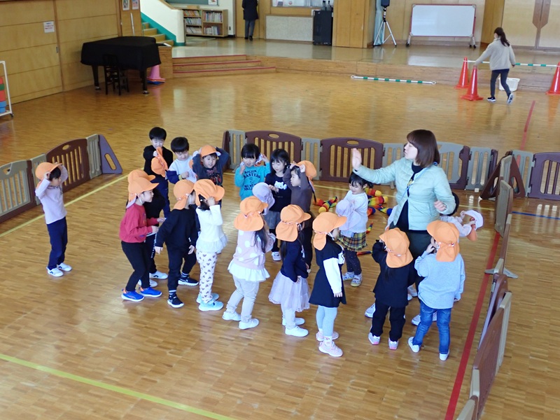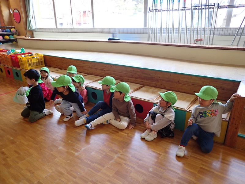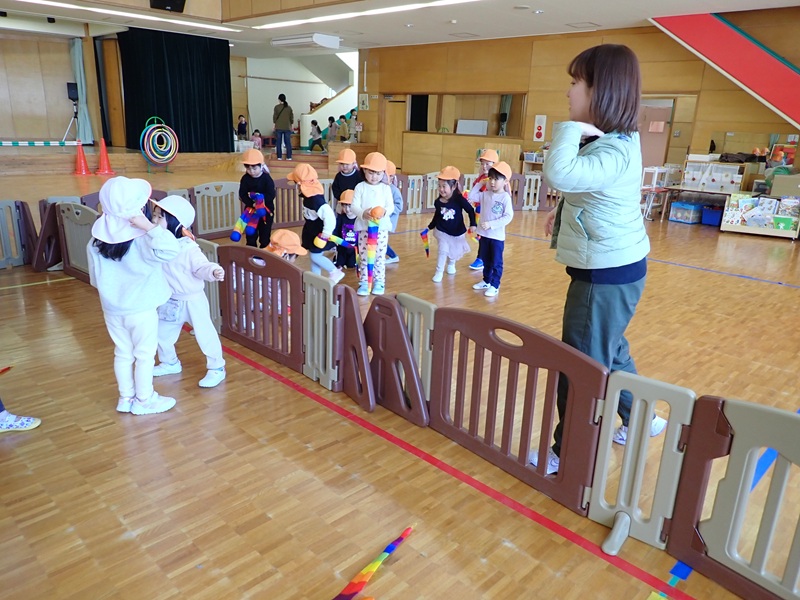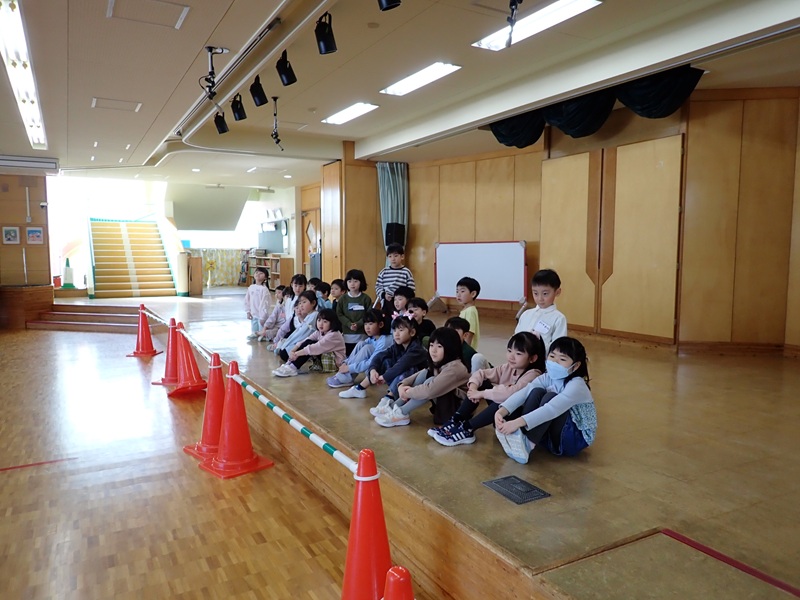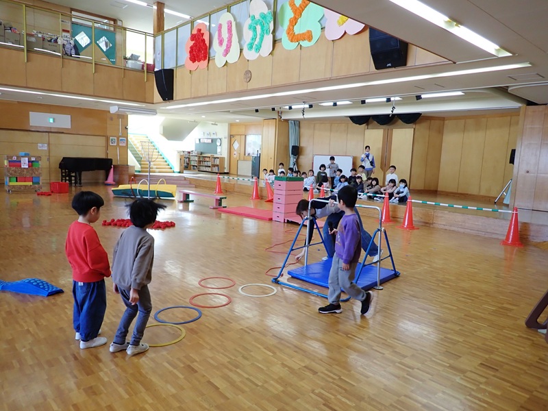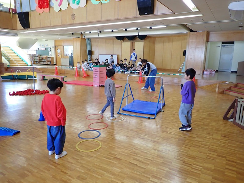 ⑥ゆり組さんはホールでサーキットを始めるため、園児さんが先生役でコースの説明をしていました。