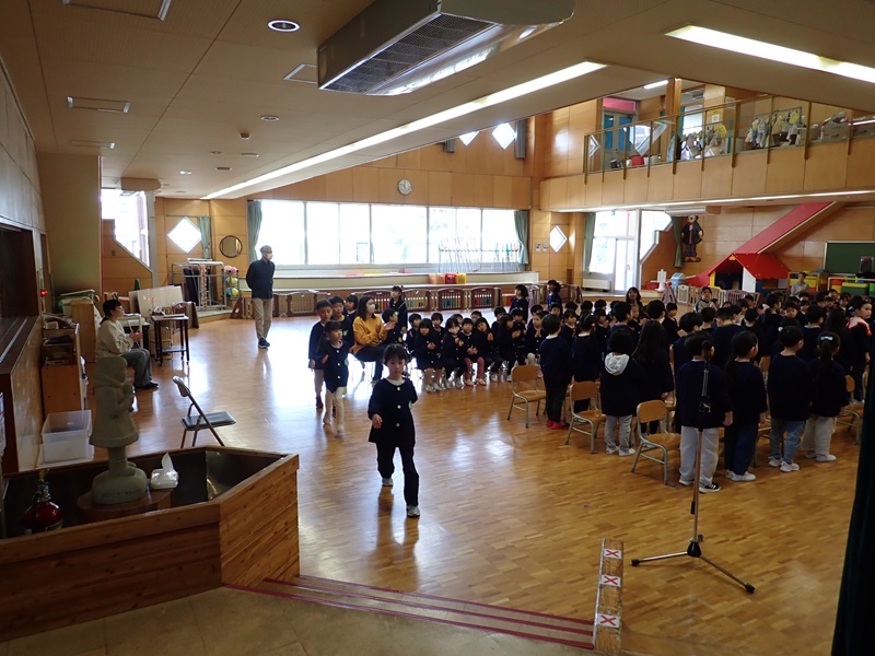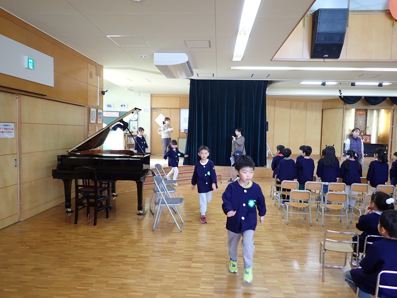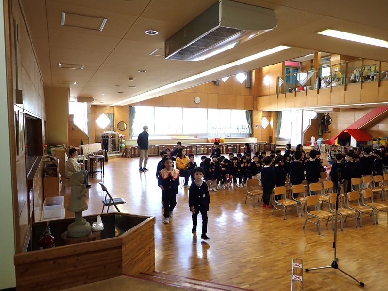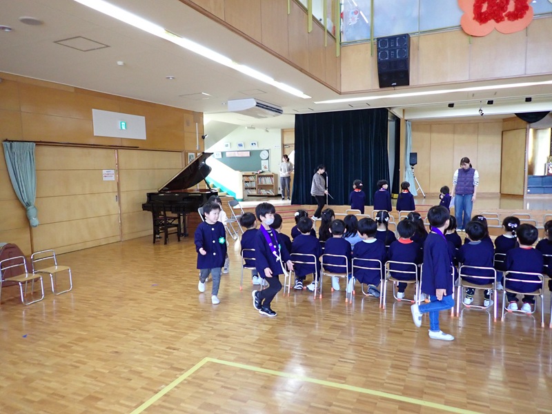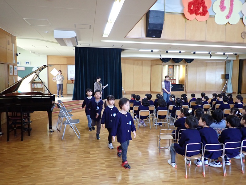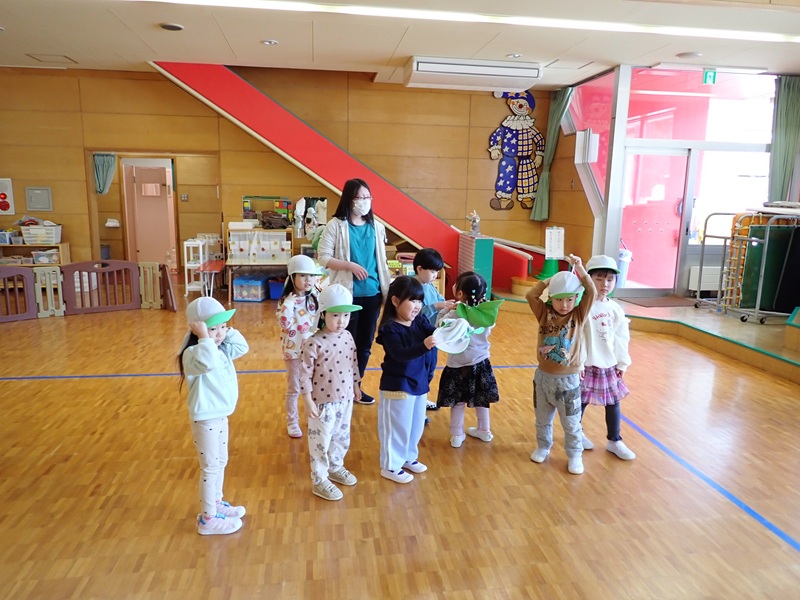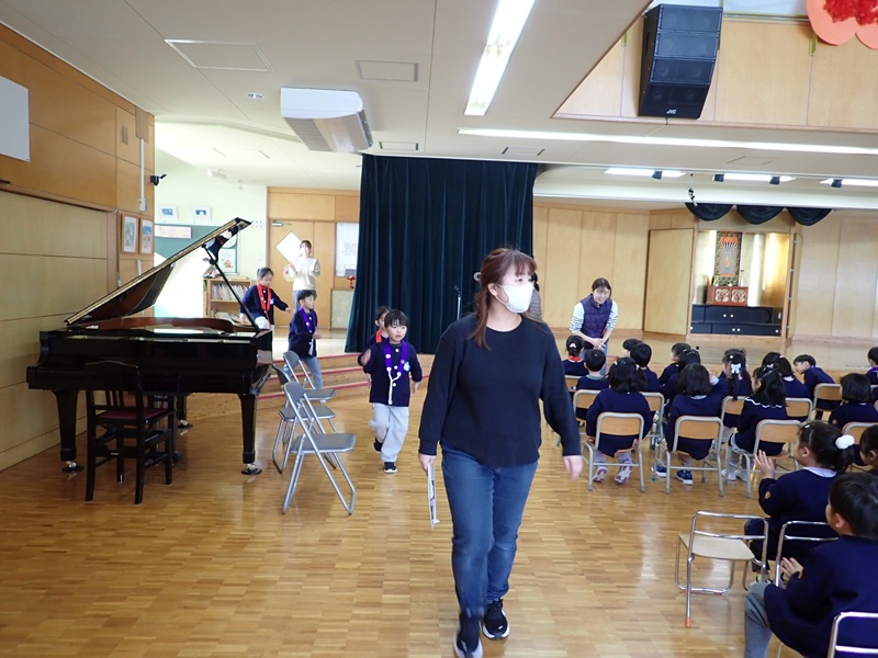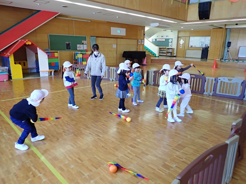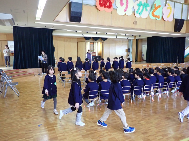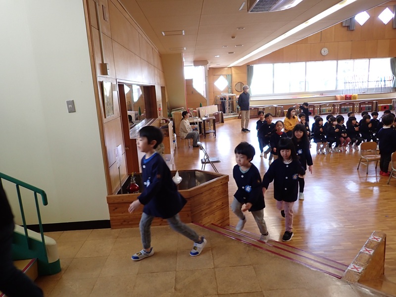 ⑥ゆり組さんはホールでサーキットを始めるため、園児さんが先生役でコースの説明をしていました。