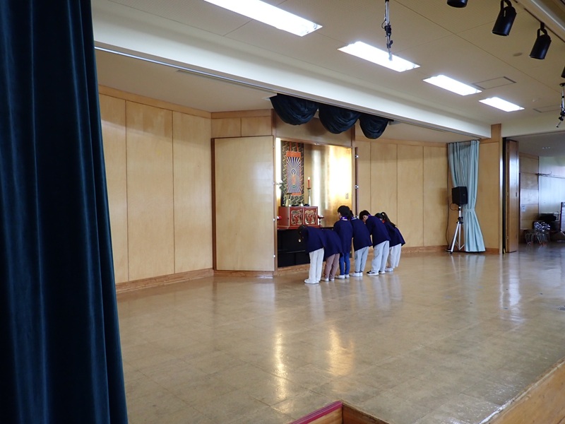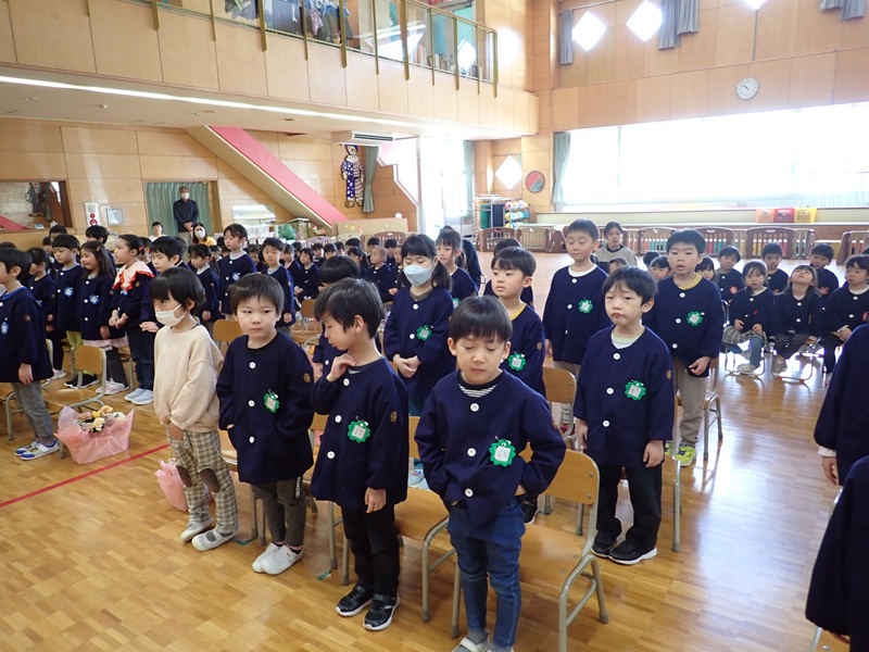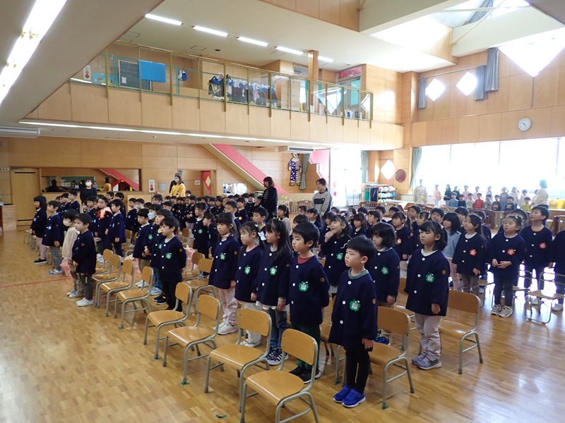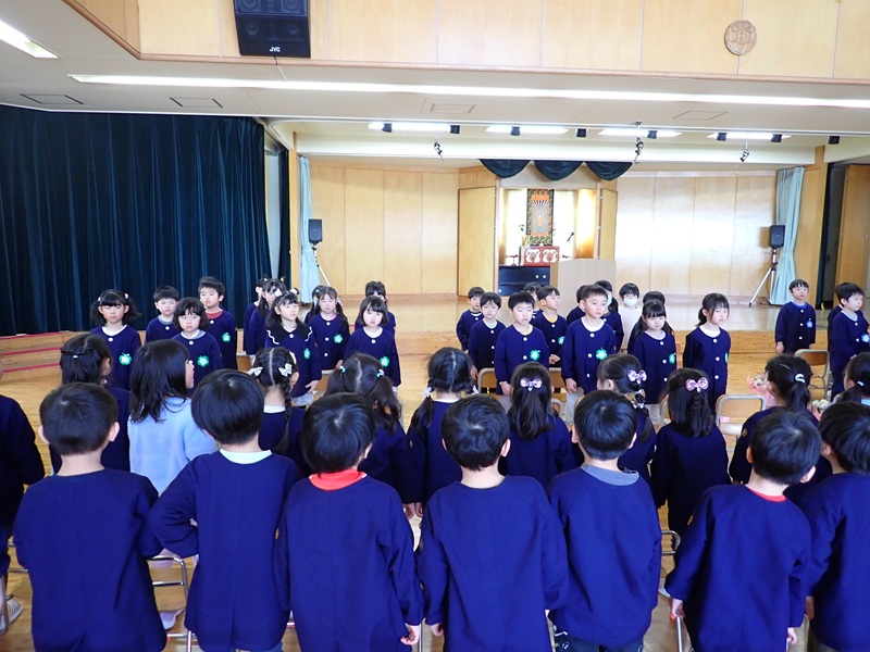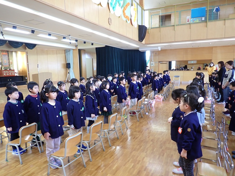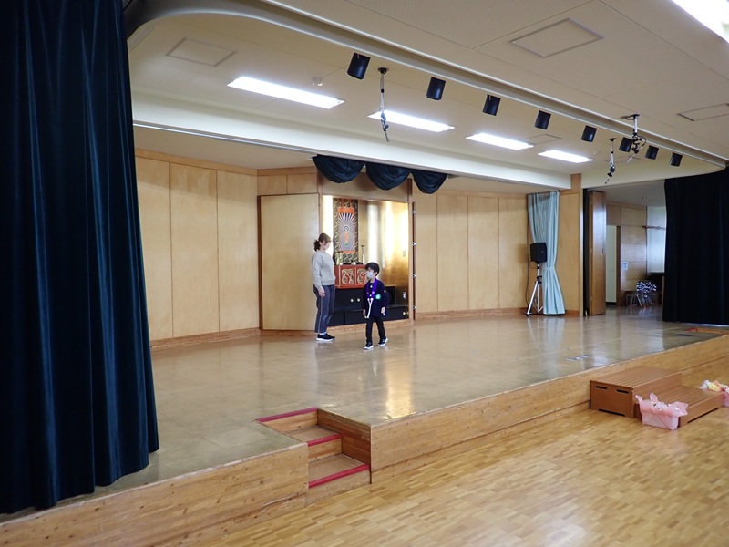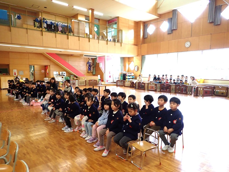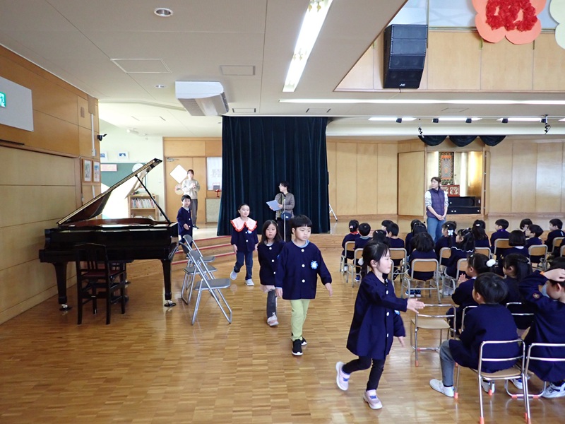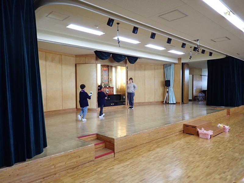 ⑥ゆり組さんはホールでサーキットを始めるため、園児さんが先生役でコースの説明をしていました。