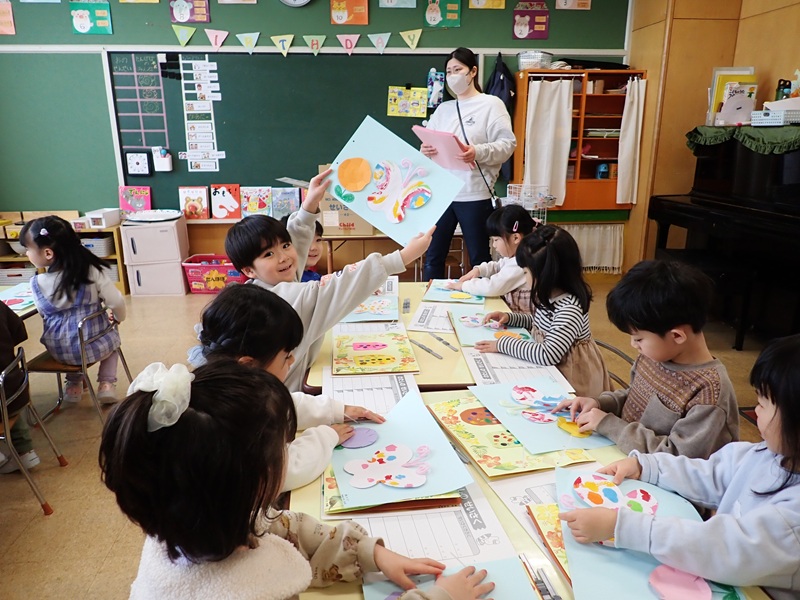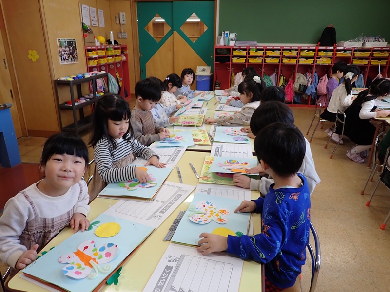 ④たんぽぽ組さんは教室でいままでの製作をチェックしていました。
