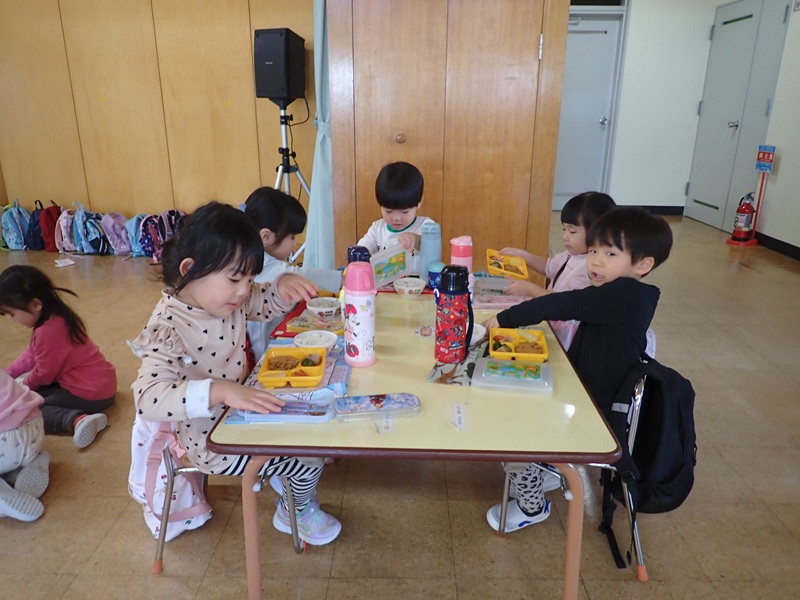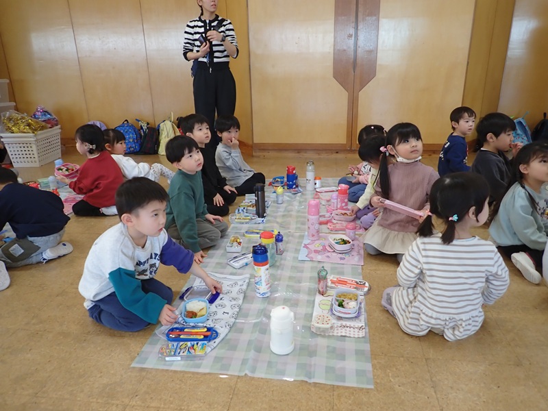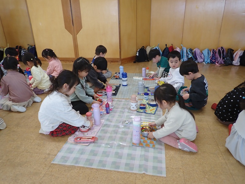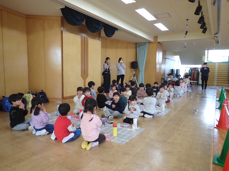 最後の6枚の写真は、年少組さんが遠足ごっこでステージで給食・弁当を食べたものです。