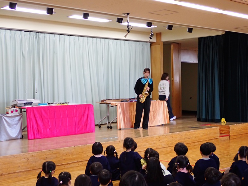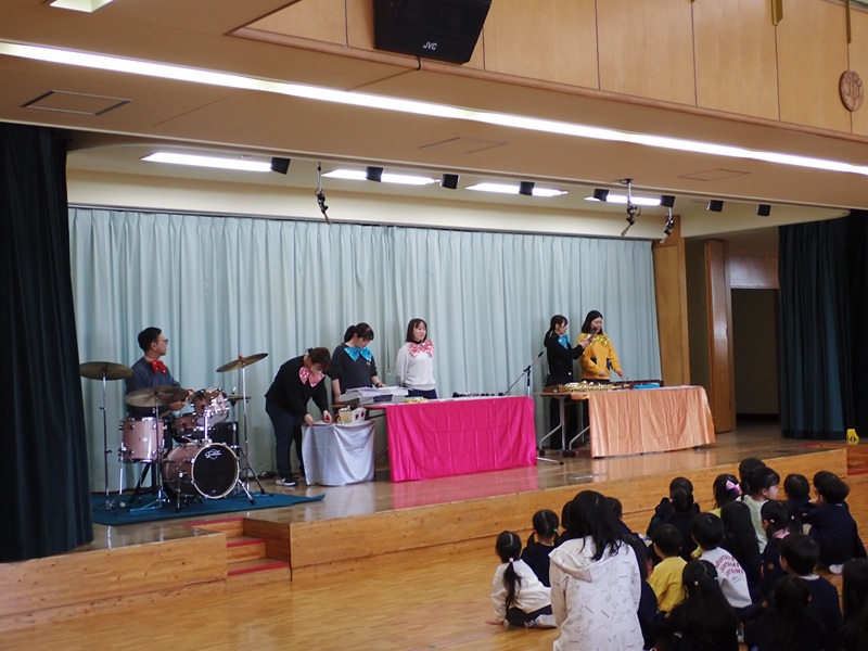 ⑤最後は、ピアノ、ドラム、クラリネット、サックスなどを先生たちが演奏しました。1曲目は、A Whole New World、2曲目は発表会でゆり組さんが踊った「新宝島」でした。ゆり組さんは曲に合わせて踊っていました!!!