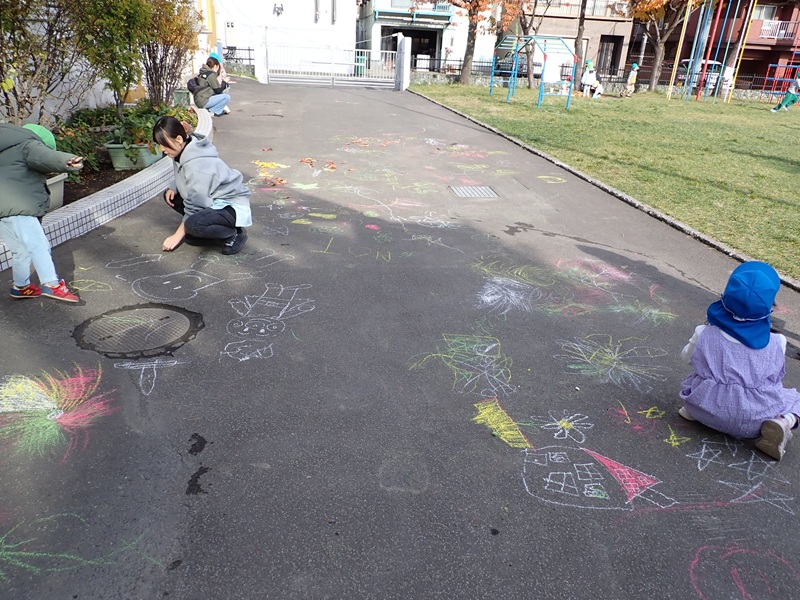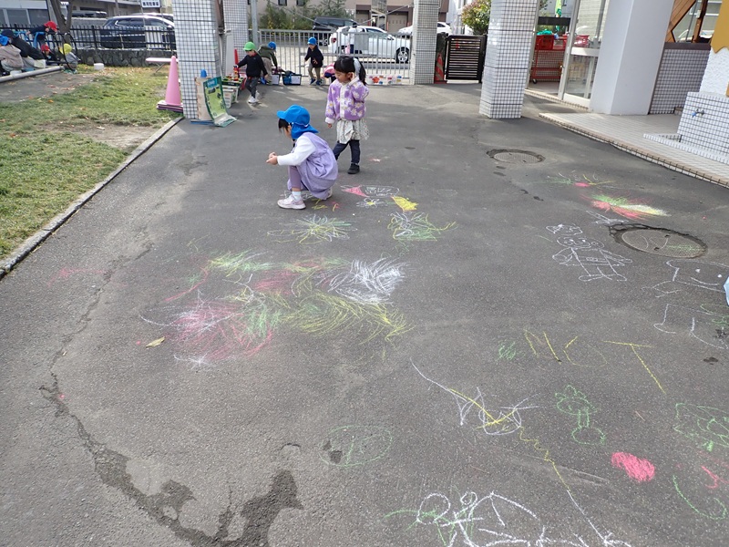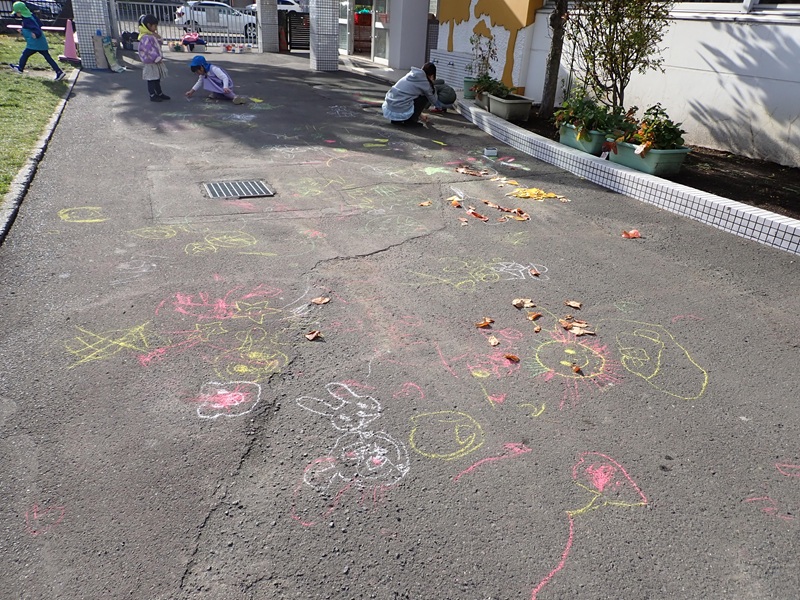 また、朝の園舎前でチョークのお絵かきを撮影しました。