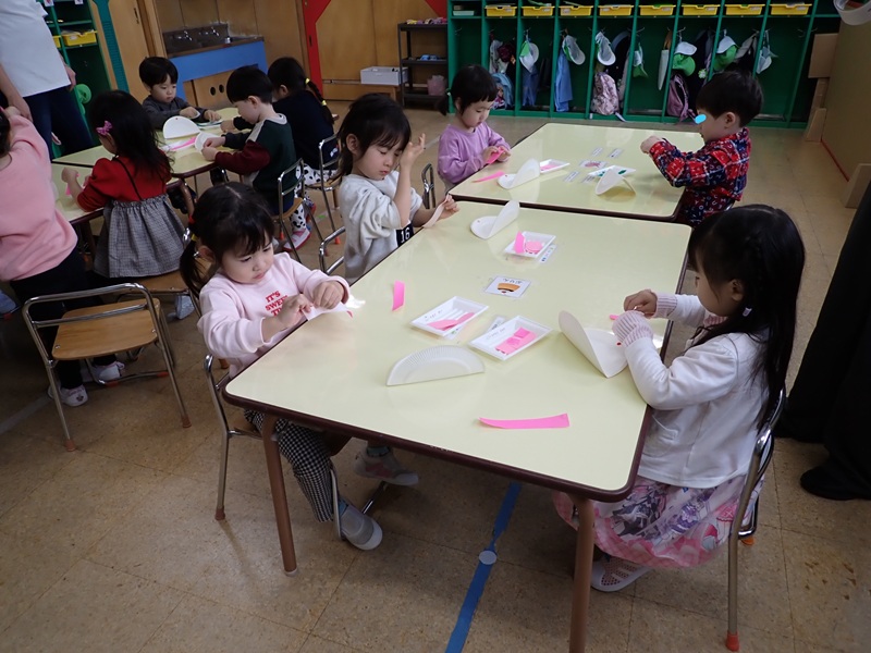 うさぎさんとかえるさんの2種類あるので、どちらにするか選んで、紙皿とペットボトルのキャップと折り紙でカスタネットを作りました。