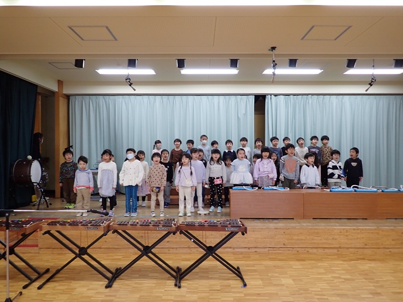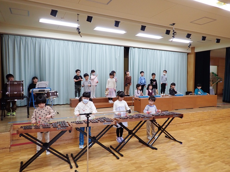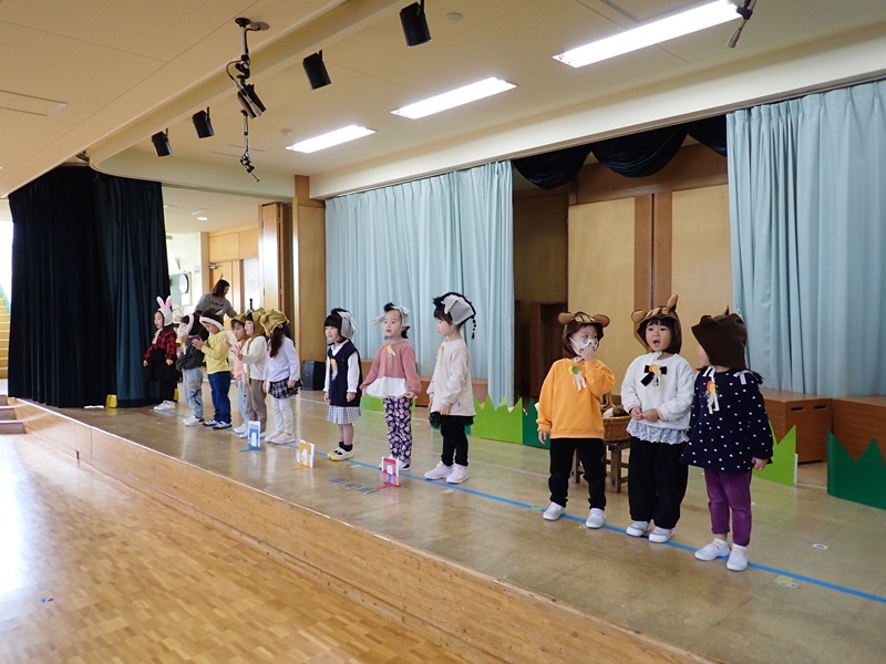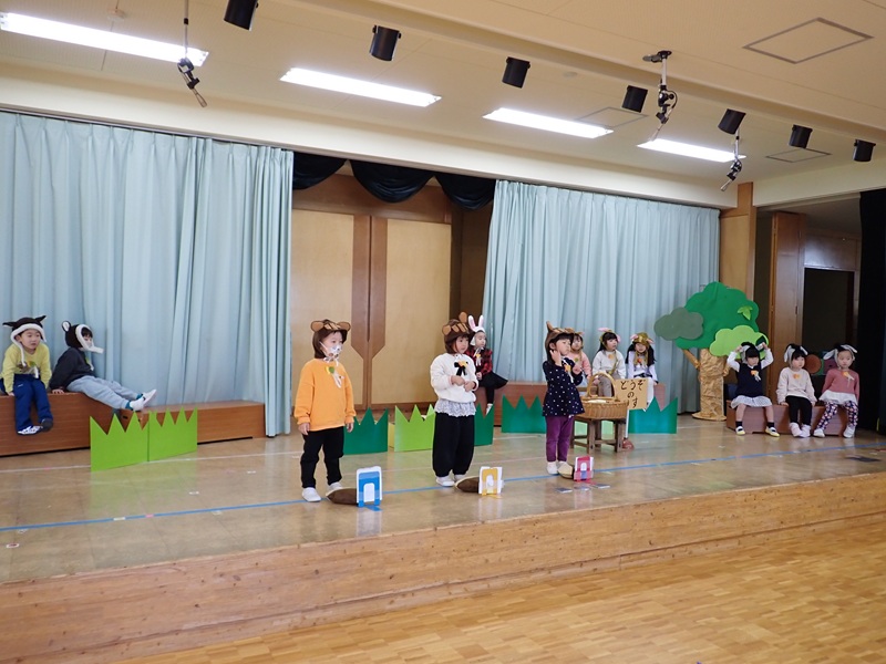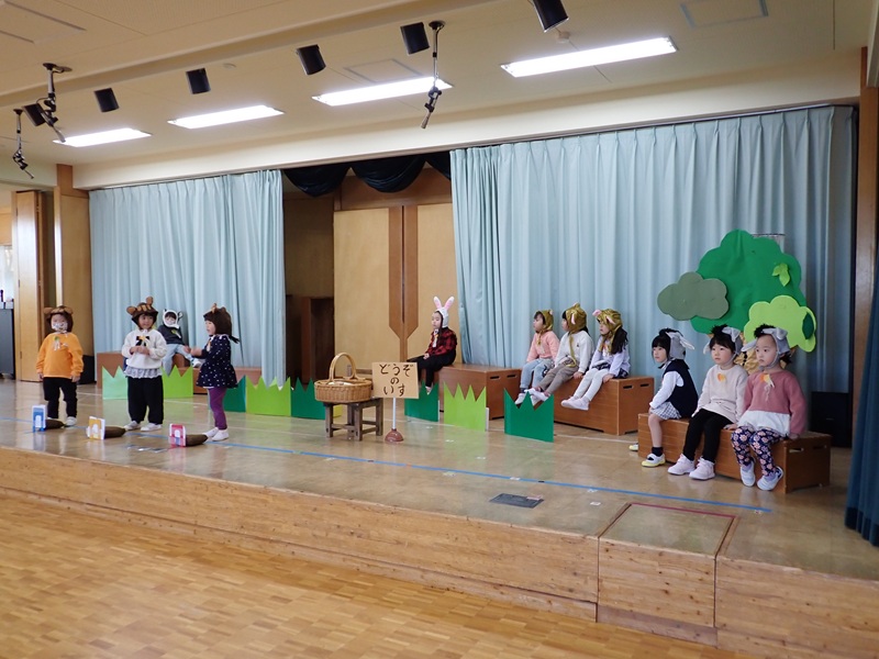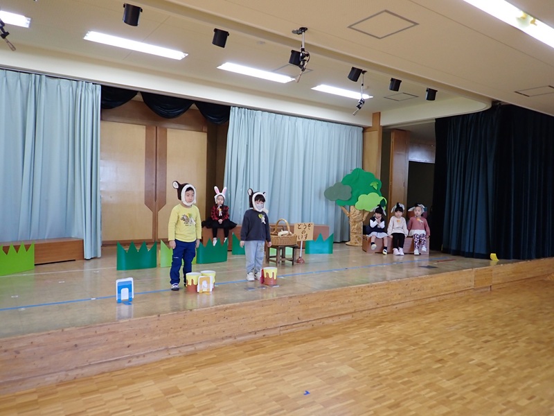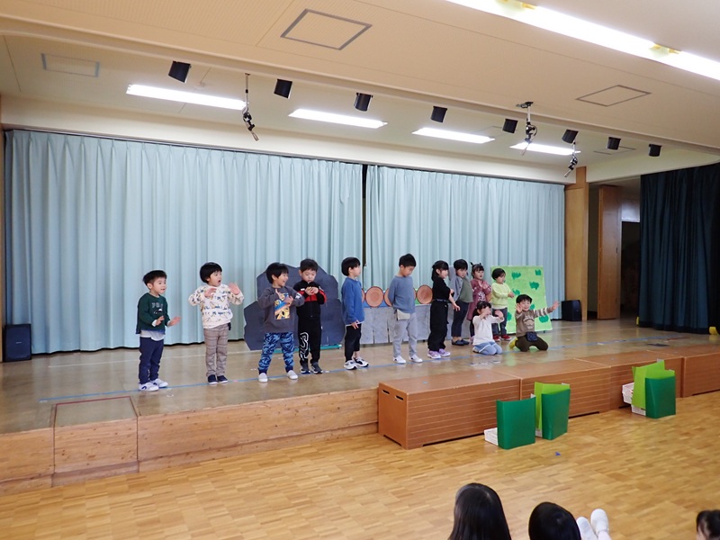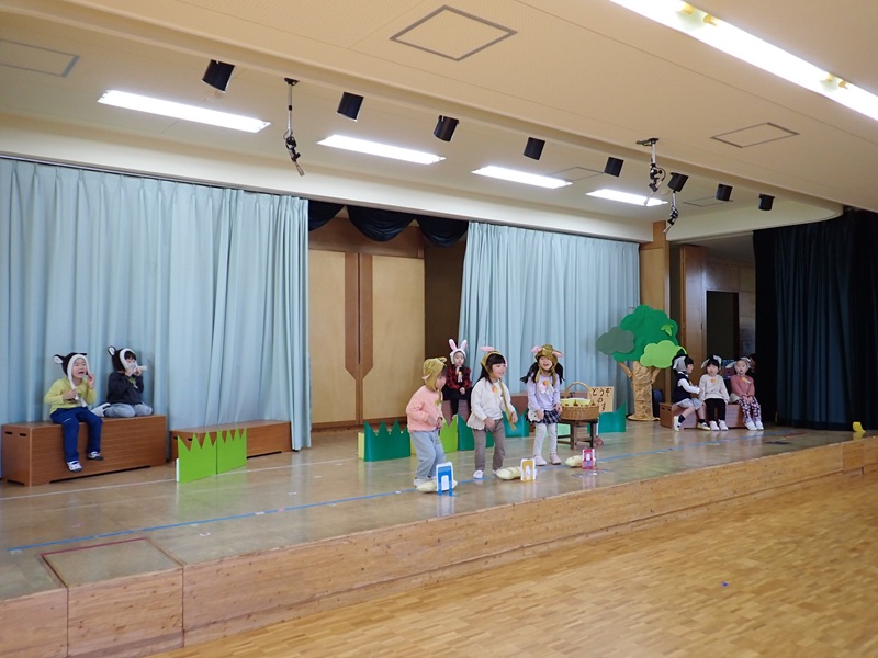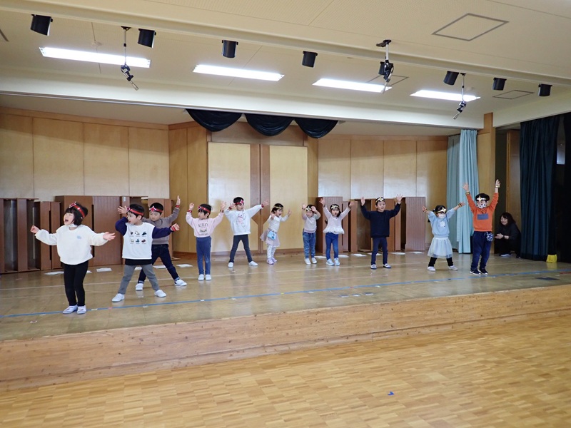 本日は、ステージで発表会の練習をしていたたんぽぽ組さんとさくら組さんの様子です。最初は、たんぽぽ組さんが遊戯の練習をしていました。