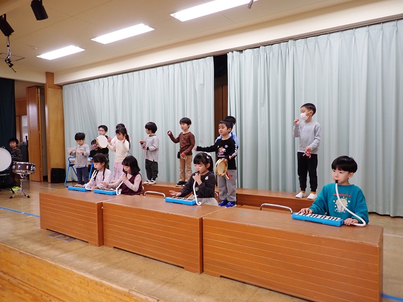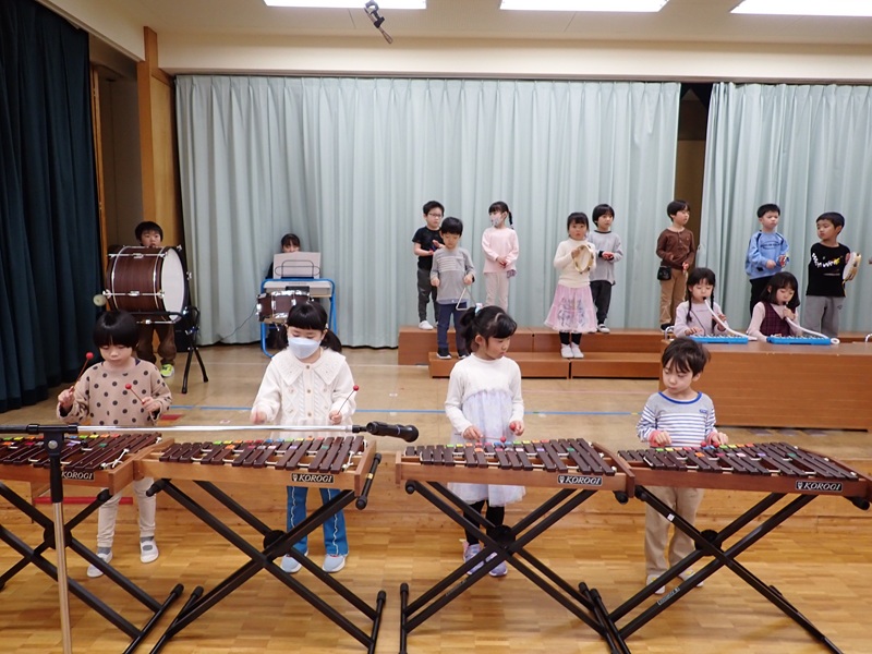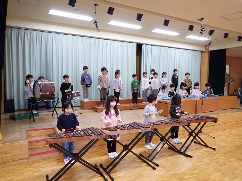 本日は、午前中の各クラスの活動をお知らせいたします。1.ゆり組さんがステージで発表会の練習をしていました。