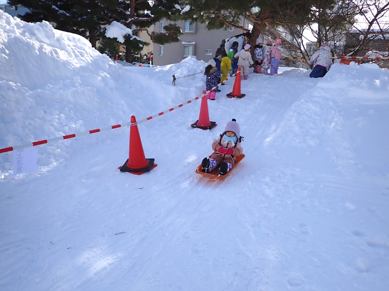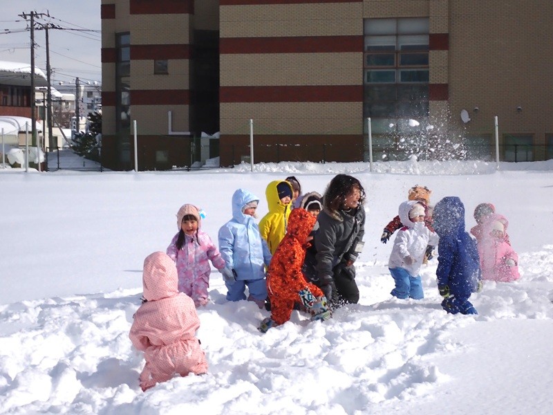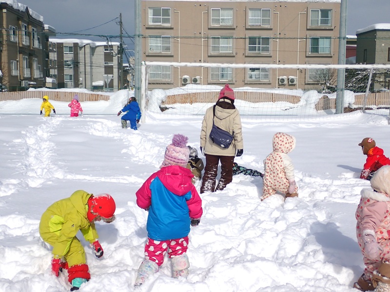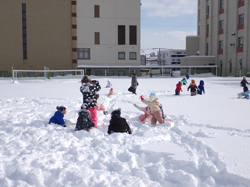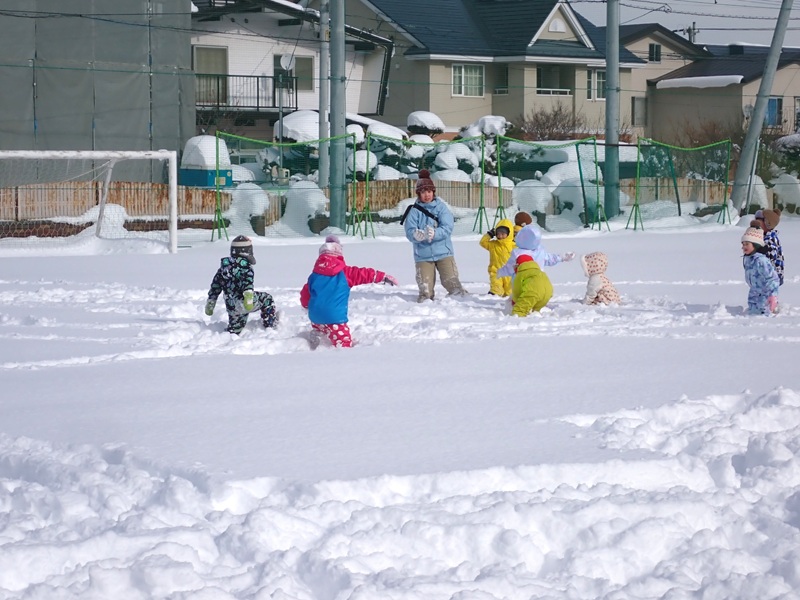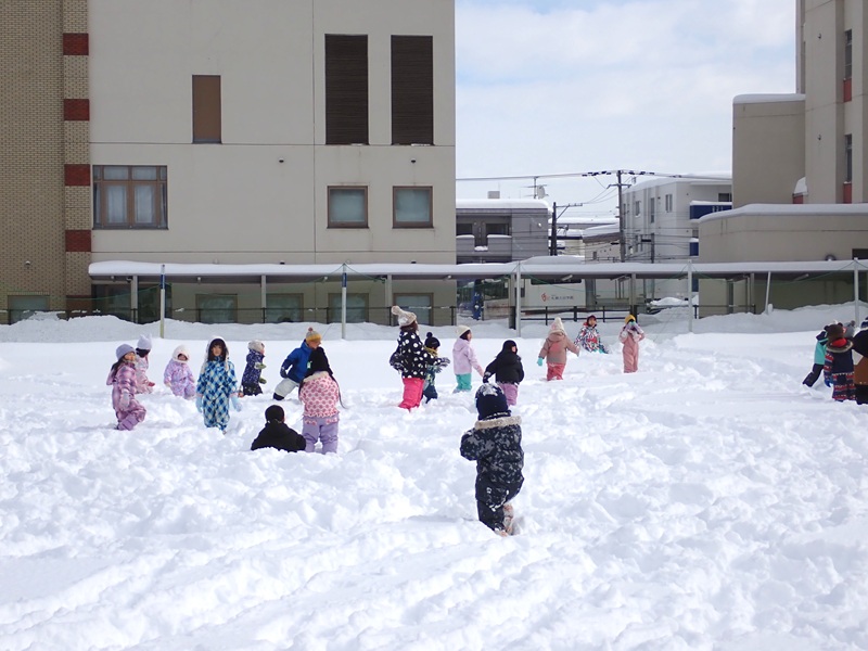 ※現在、園庭の雪山は高く上まで登ると、埋まったり、道路側に落ちたりと大変危険です。よって雪山に登ることは禁止しています。園庭での雪遊びも先生たちが付いているときは実施していますが、園からの帰りに園児さんたちだけで遊ぶことは危険ですのでお止めいただくようお願いいたします。