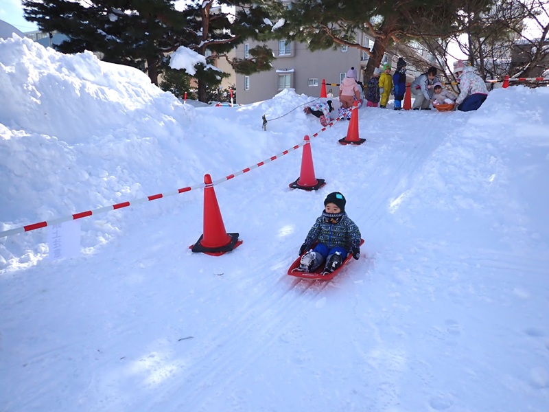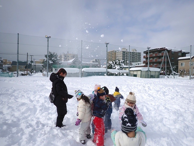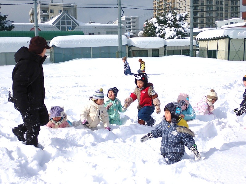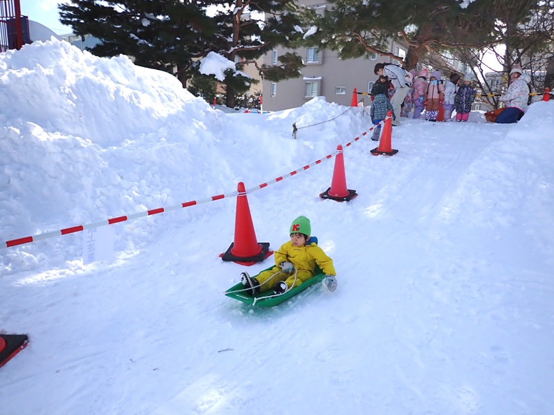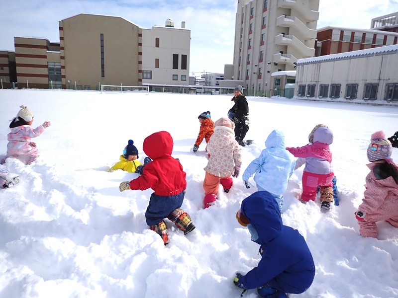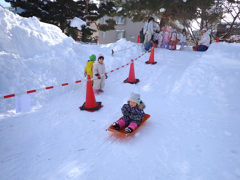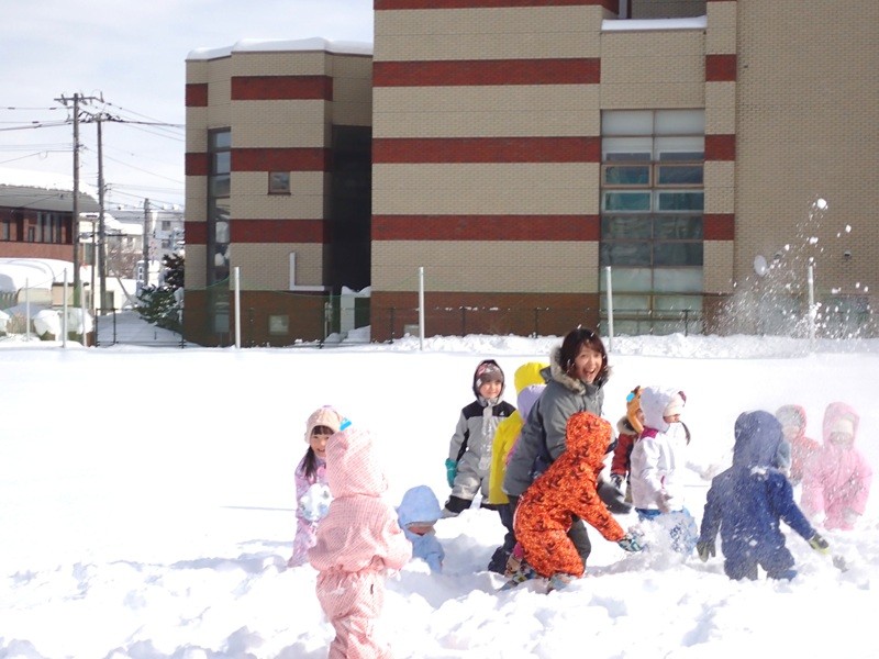 ※現在、園庭の雪山は高く上まで登ると、埋まったり、道路側に落ちたりと大変危険です。よって雪山に登ることは禁止しています。園庭での雪遊びも先生たちが付いているときは実施していますが、園からの帰りに園児さんたちだけで遊ぶことは危険ですのでお止めいただくようお願いいたします。
