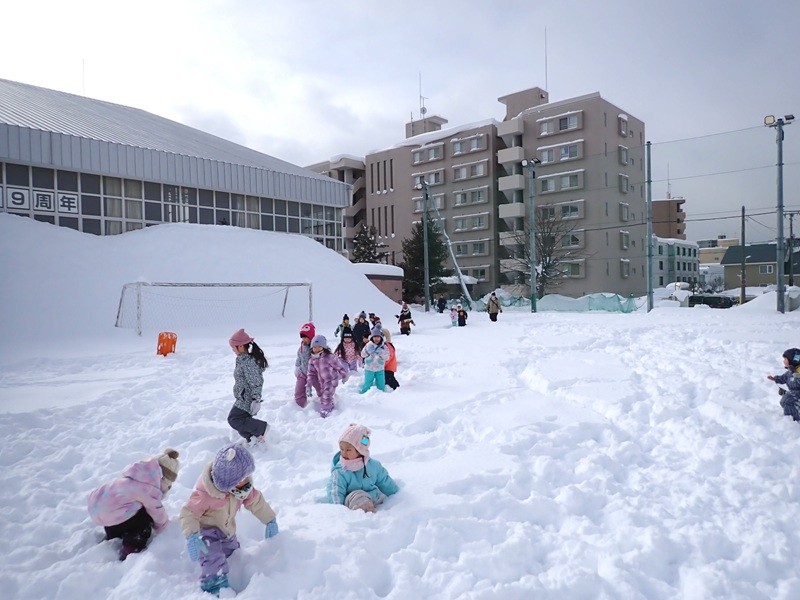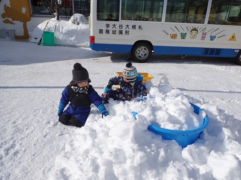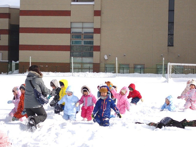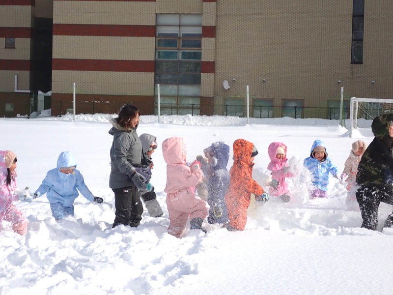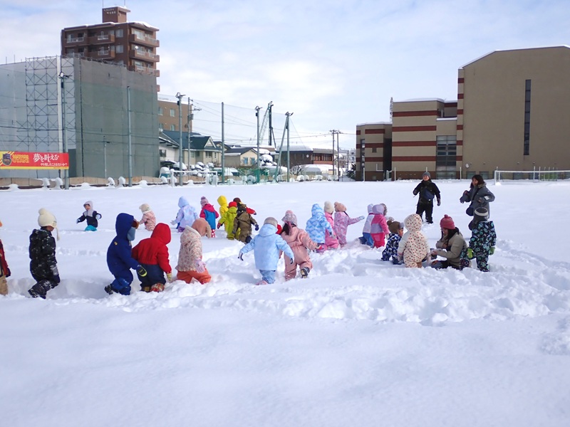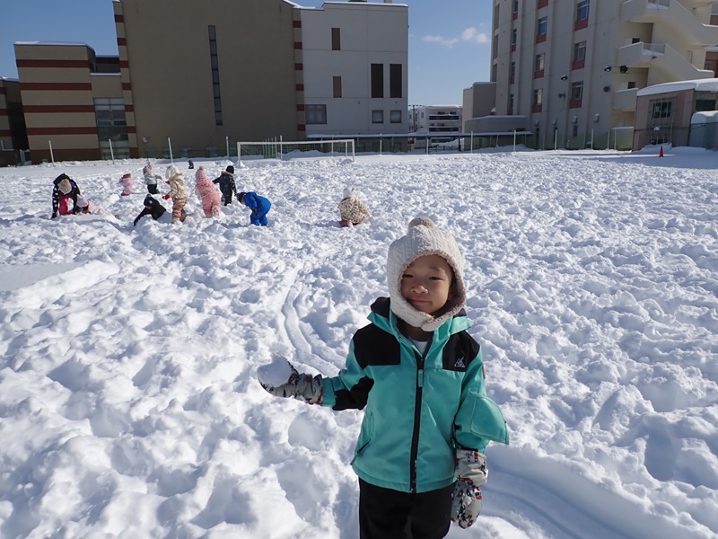 本日も自主登園にご協力いただき、誠にありがとうございました。そして、今日は年少組さんと年中組さんが大谷中高のグランドで雪遊びを楽しみました。