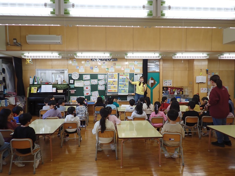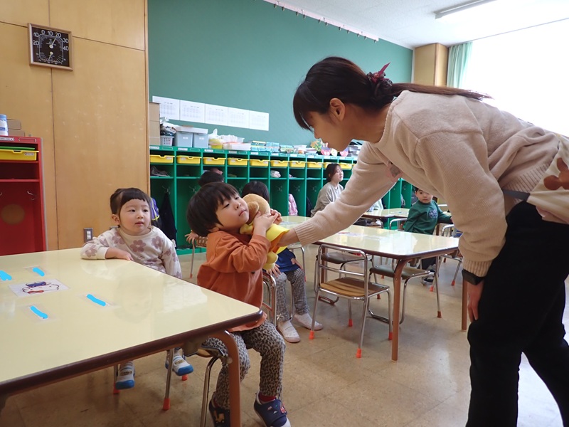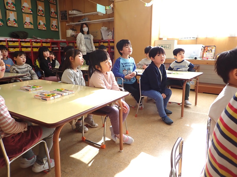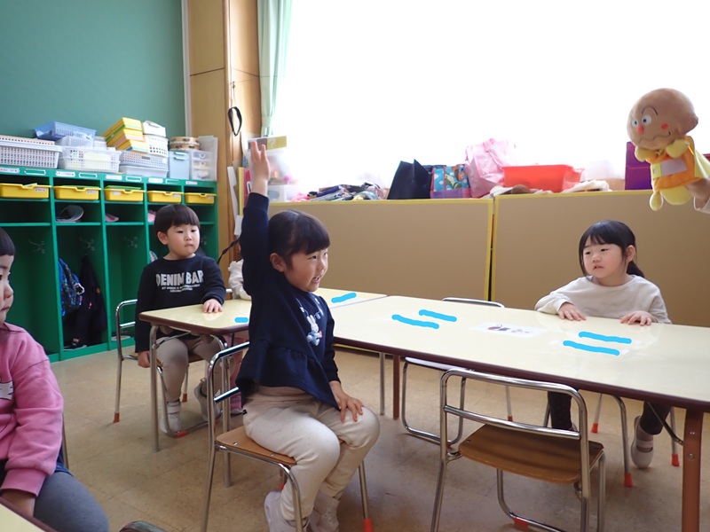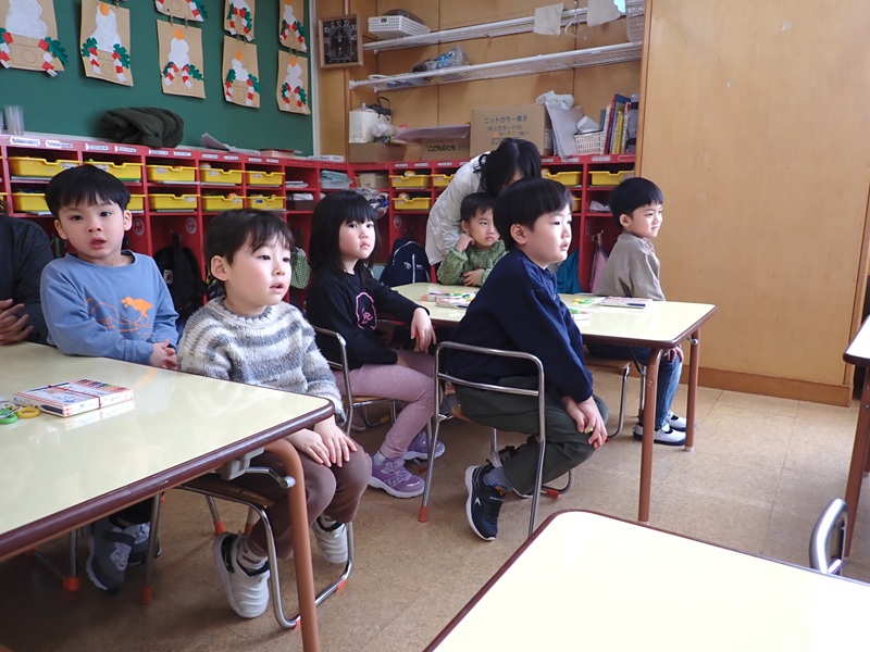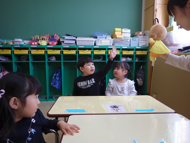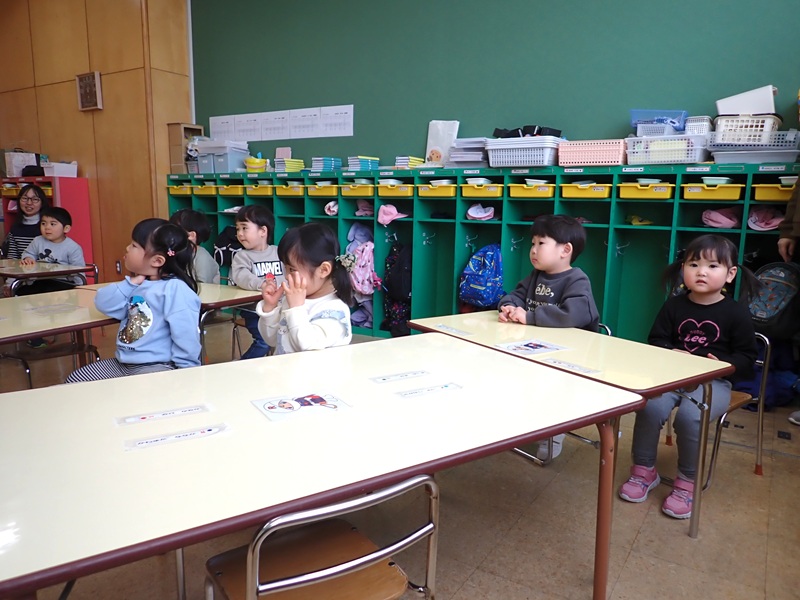 ②もも組さんの朝の会の様子です。元気にお返事していました。