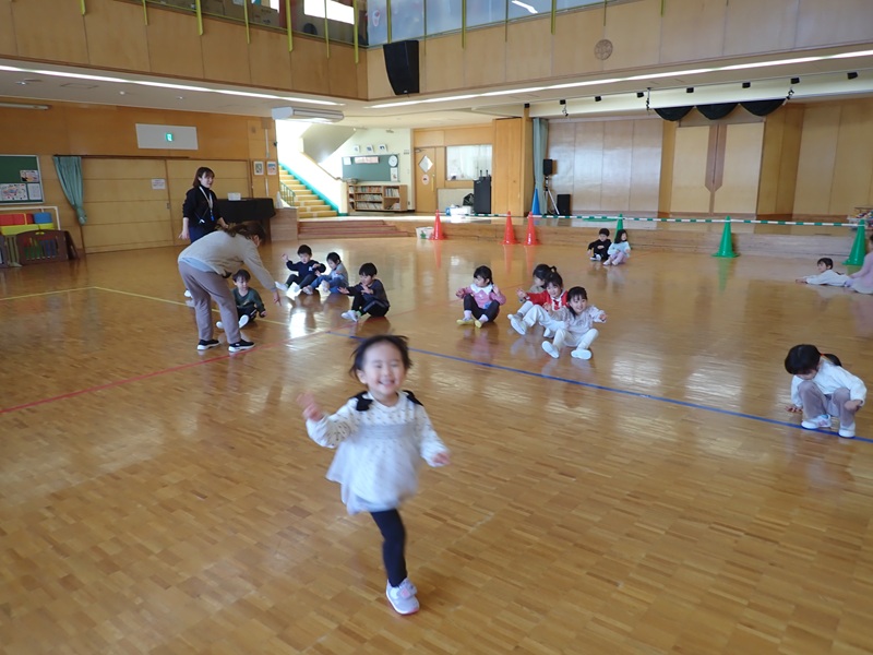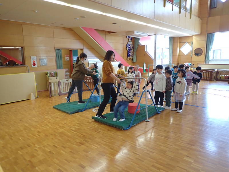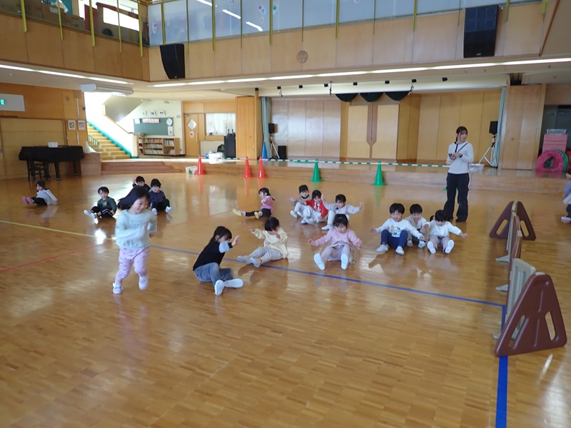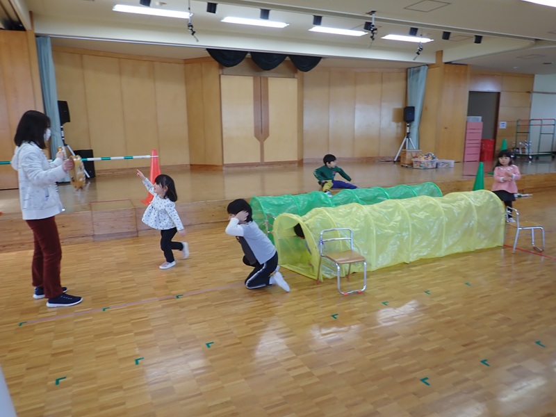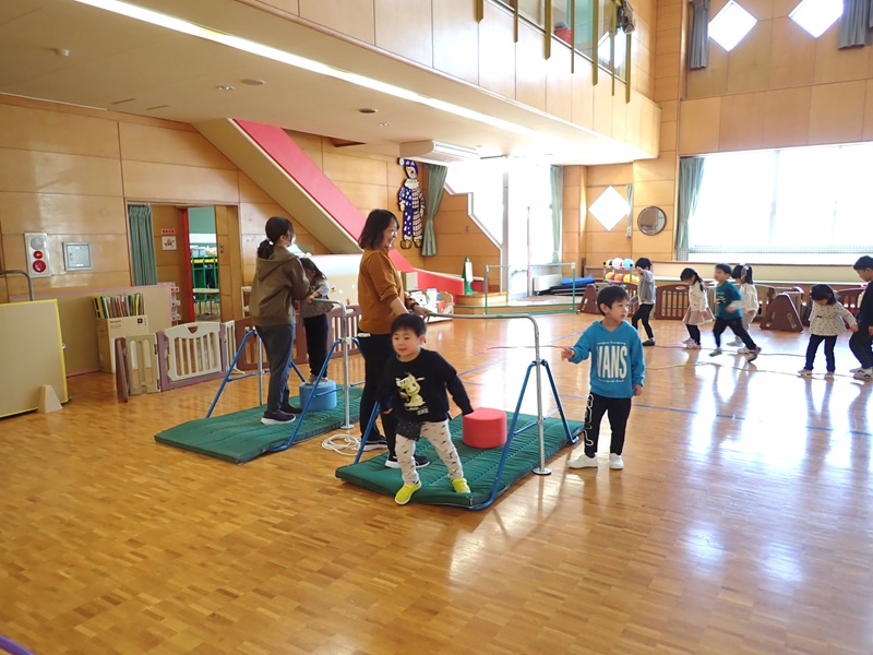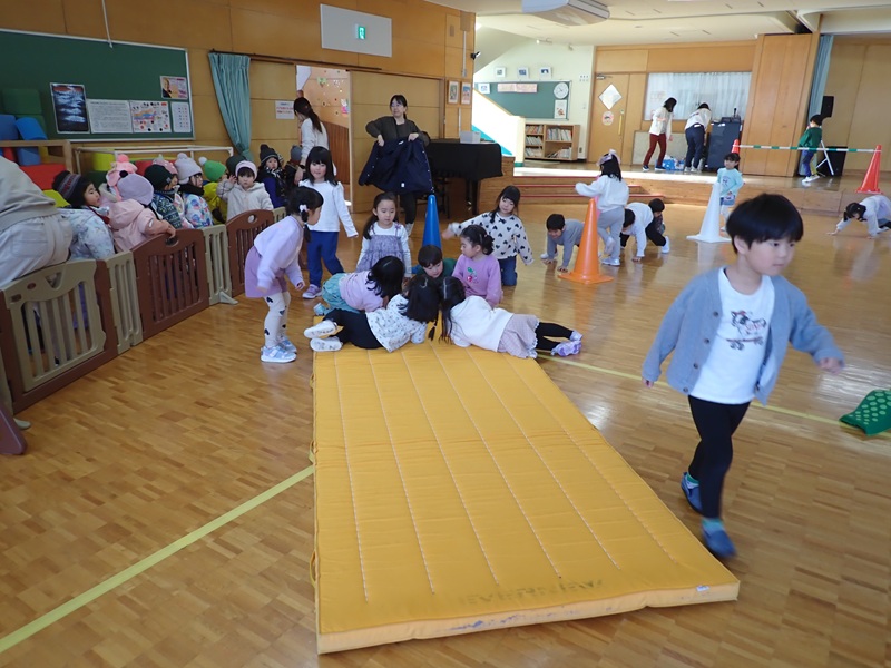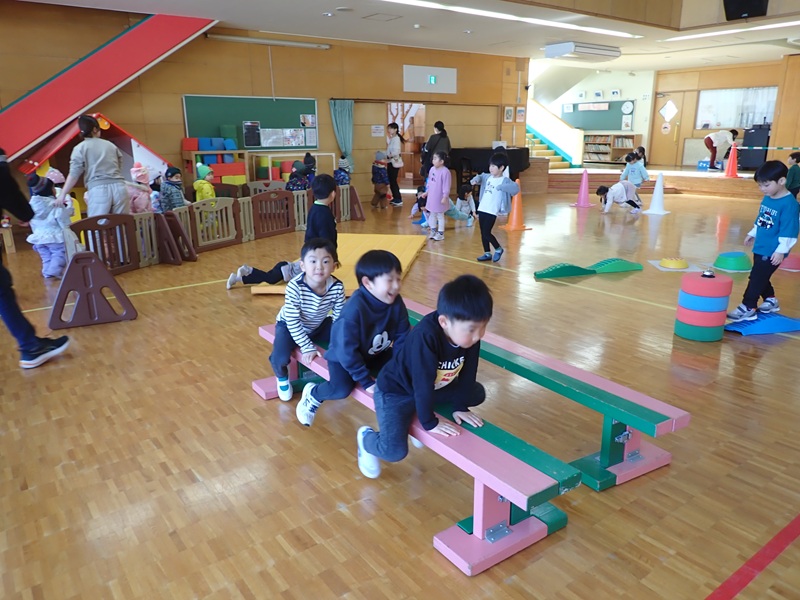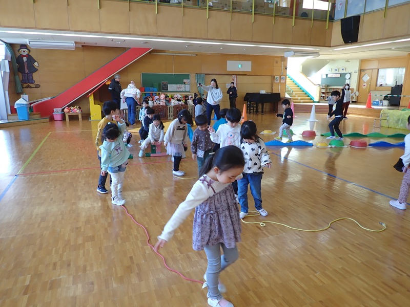 本日の午前中の様子は以下の内容です。①年少組さんがホールでサーキット遊び