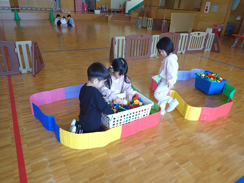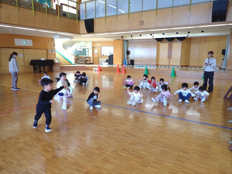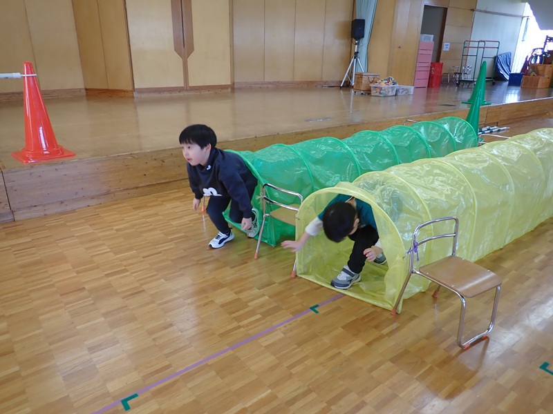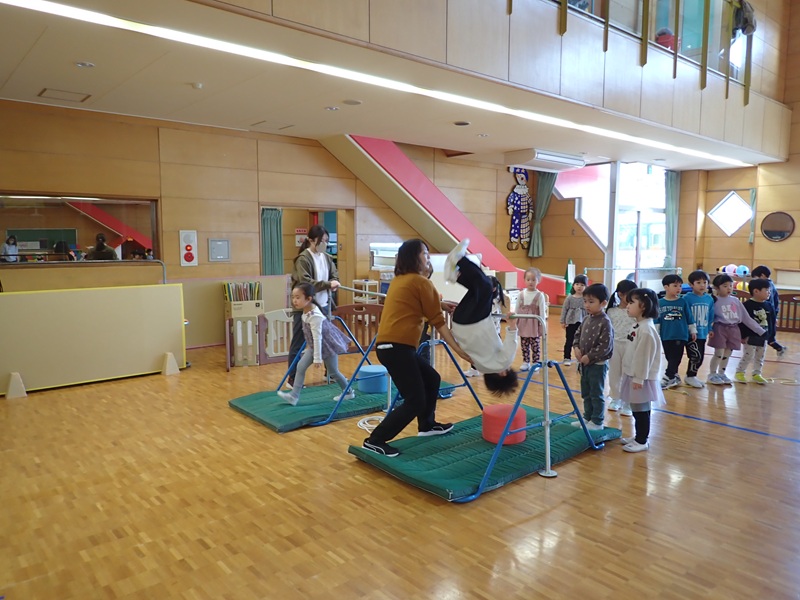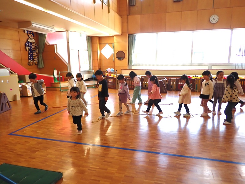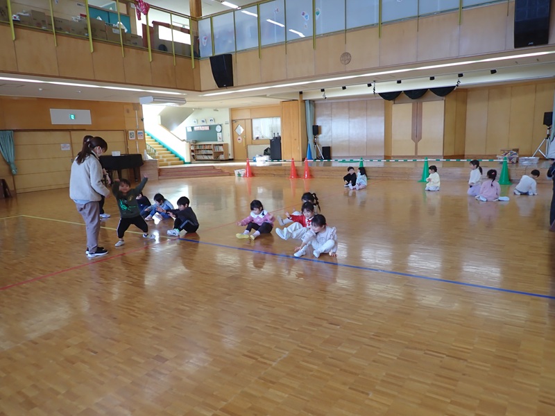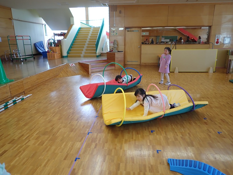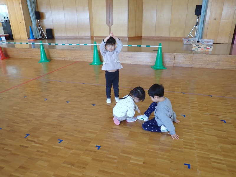 本日の午前中の様子は以下の内容です。①年少組さんがホールでサーキット遊び