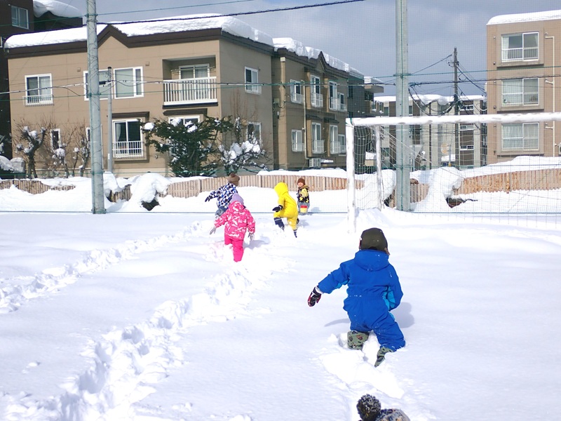 ⑥年少組さんとゆり組さんが中高のグランドで雪にまみれていました。