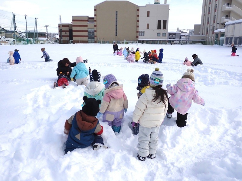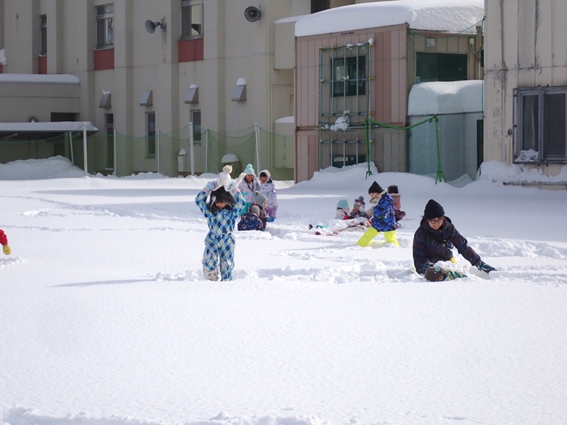 ⑤もも組さんが園庭で雪遊びを楽しんでいました。