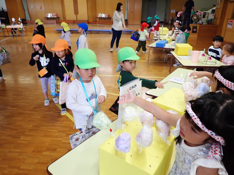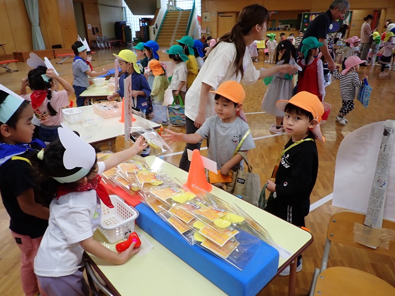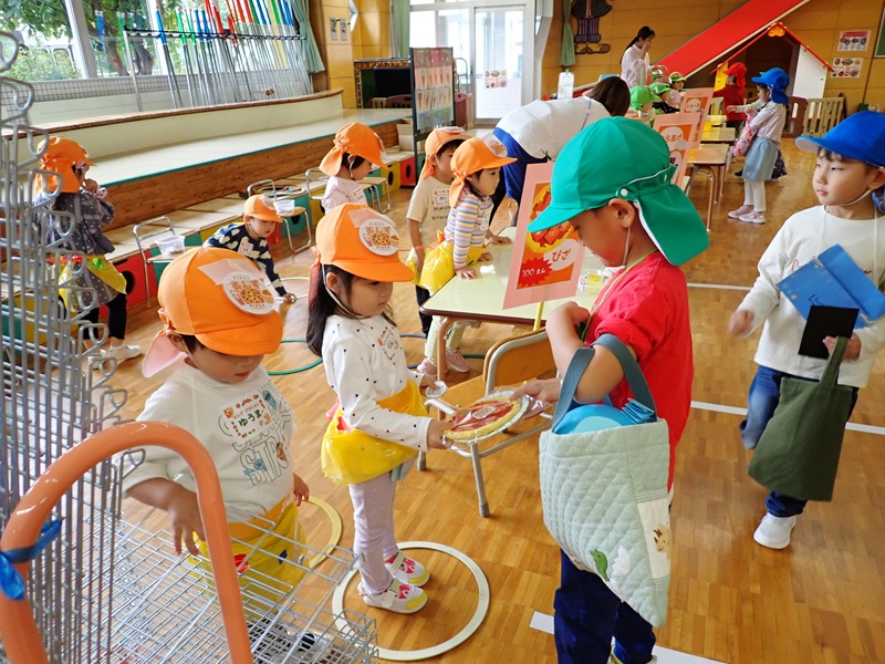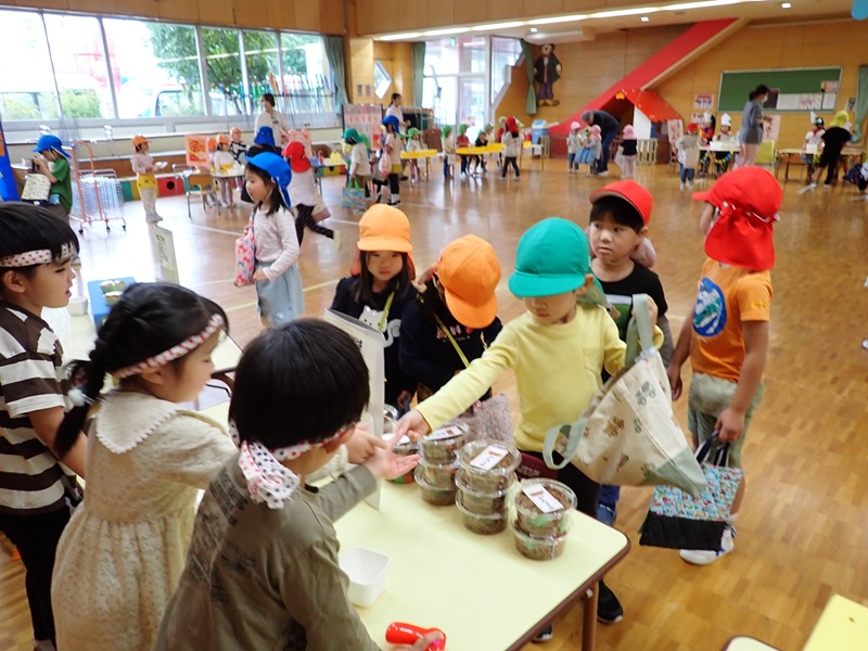 お客さんになった園児さんは、どの商品を買おうかいろいろなお店を見てから、いっぱい買い物をしていました。