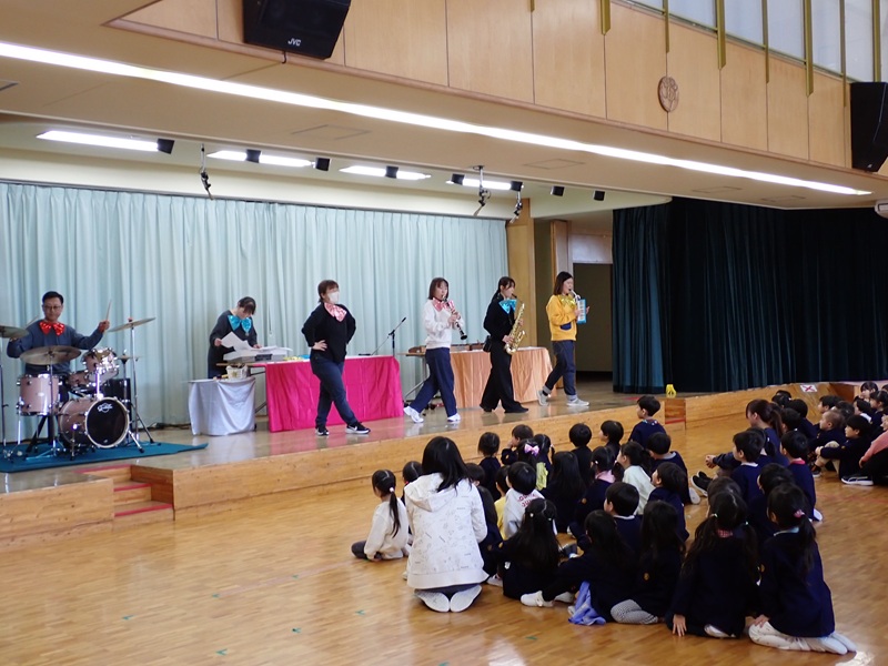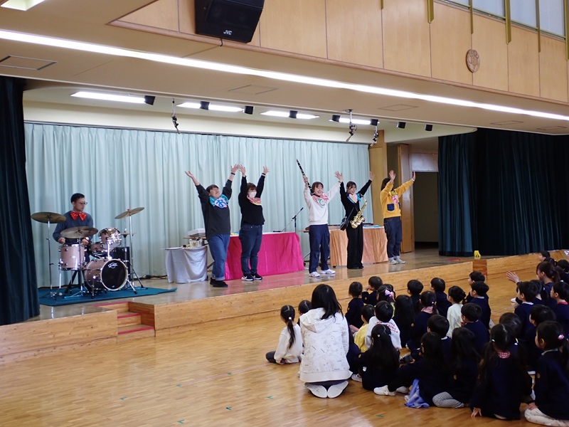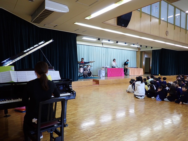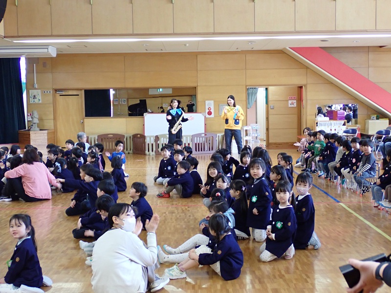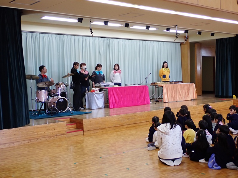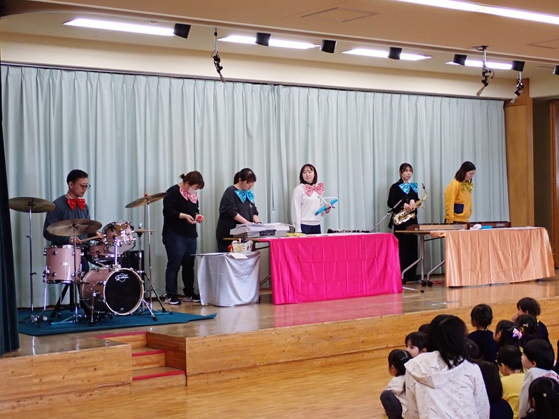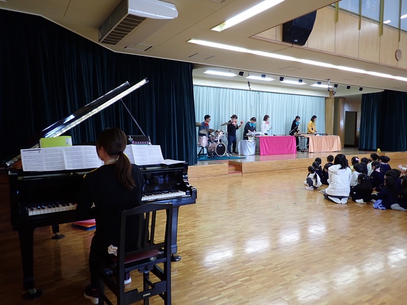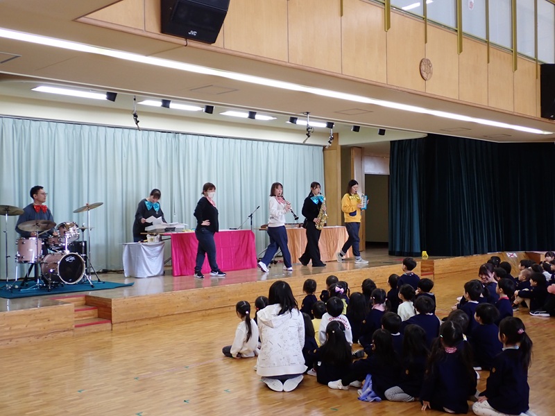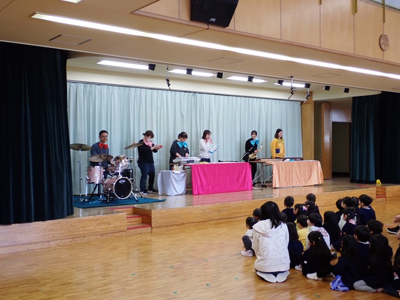 ⑤最後は、ピアノ、ドラム、クラリネット、サックスなどを先生たちが演奏しました。1曲目は、A Whole New World、2曲目は発表会でゆり組さんが踊った「新宝島」でした。ゆり組さんは曲に合わせて踊っていました!!!