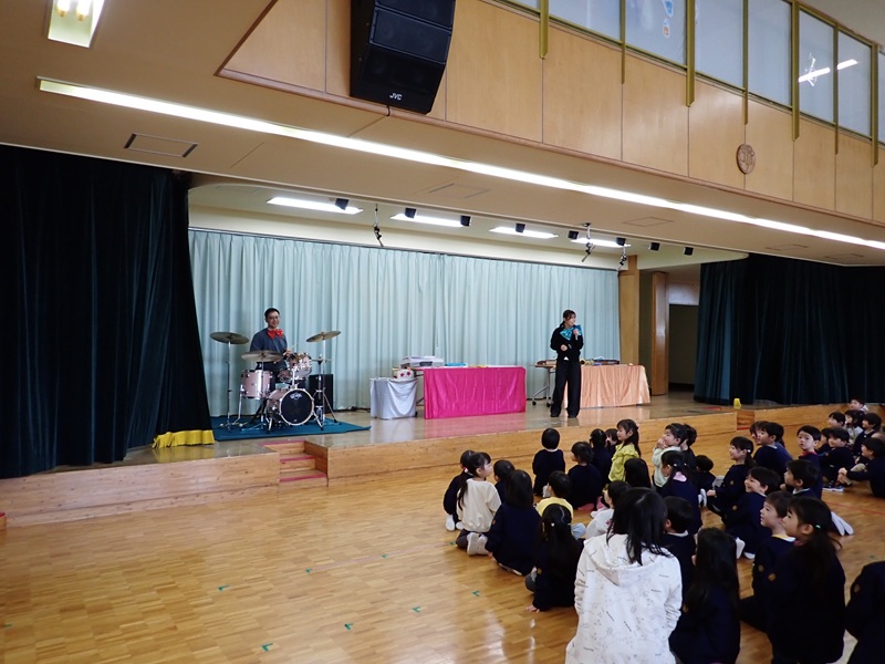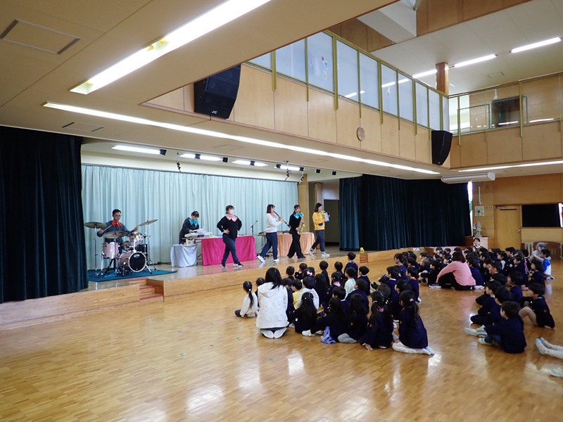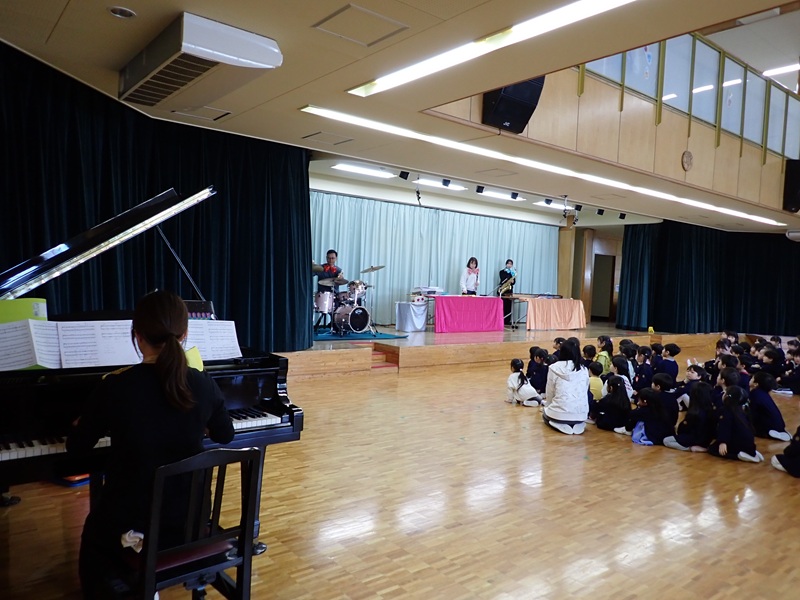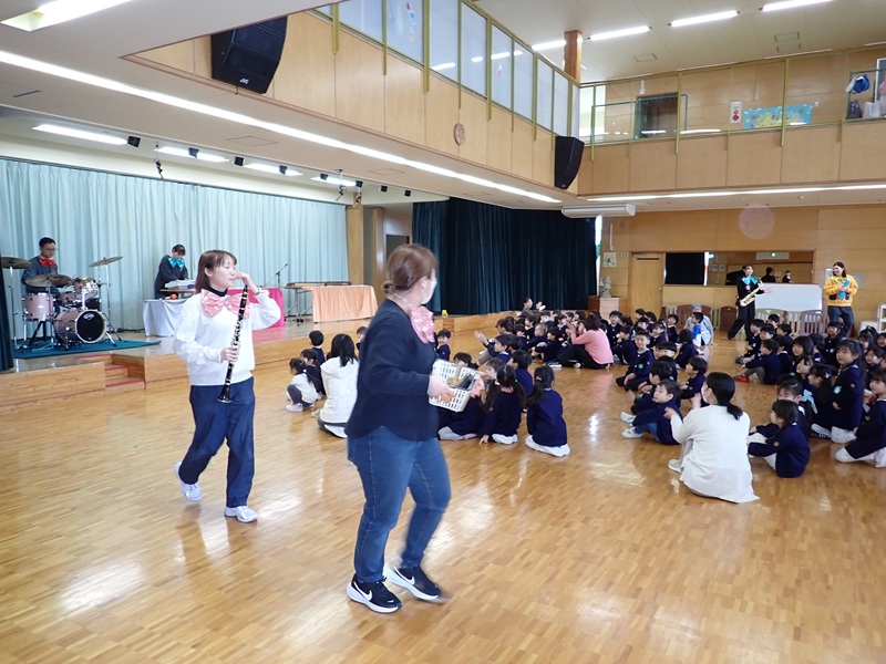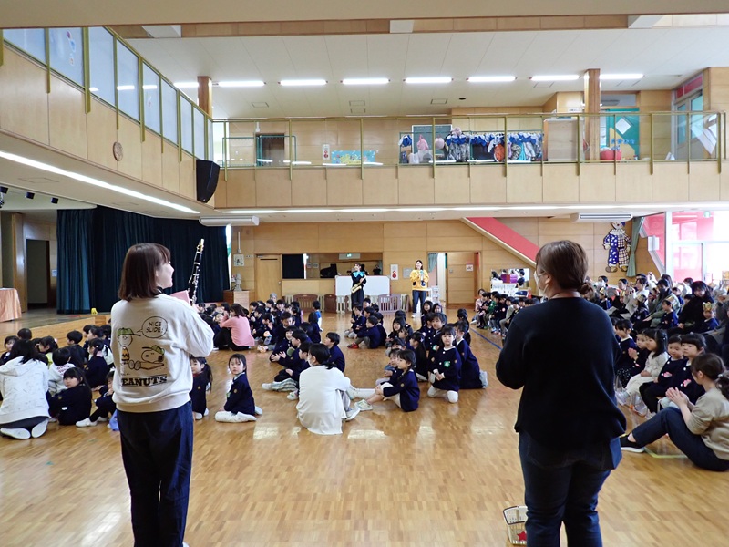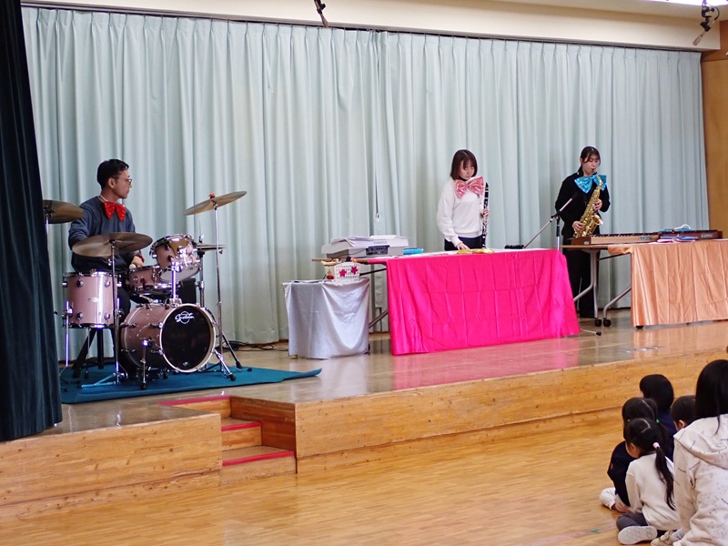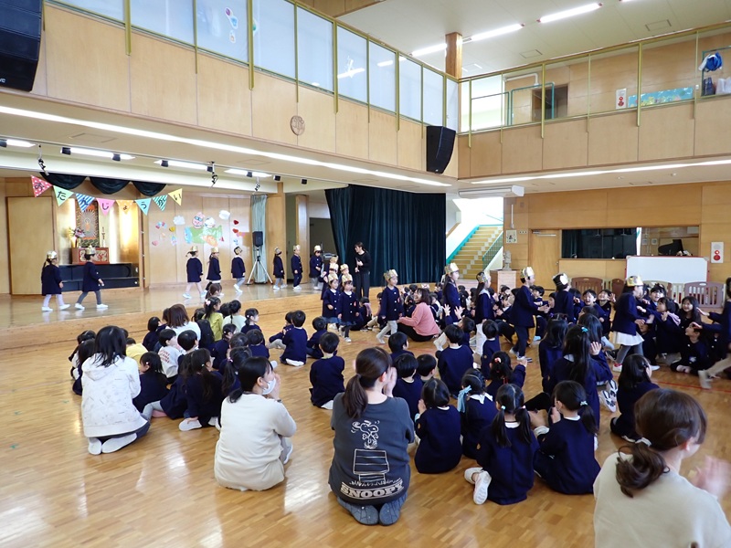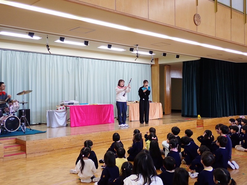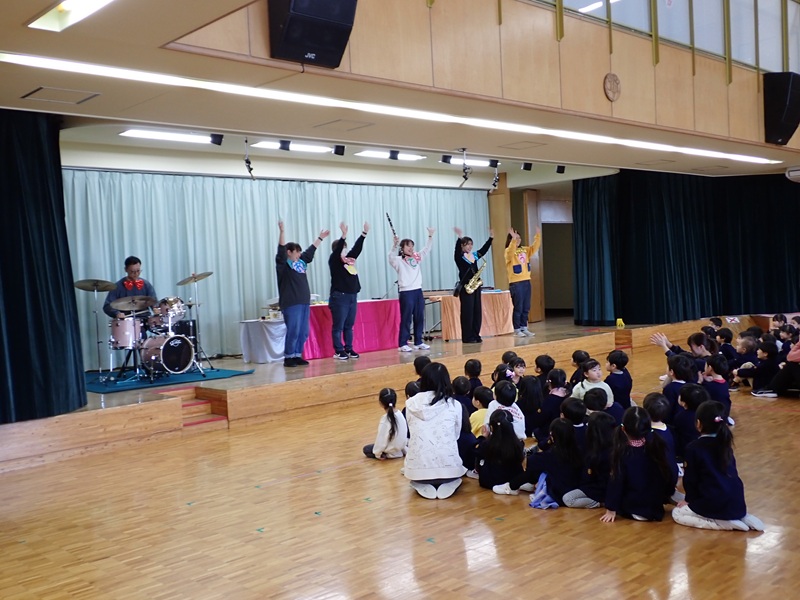 ⑤最後は、ピアノ、ドラム、クラリネット、サックスなどを先生たちが演奏しました。1曲目は、A Whole New World、2曲目は発表会でゆり組さんが踊った「新宝島」でした。ゆり組さんは曲に合わせて踊っていました!!!