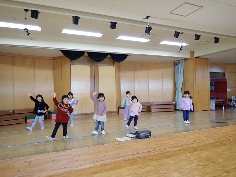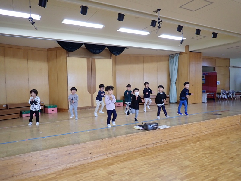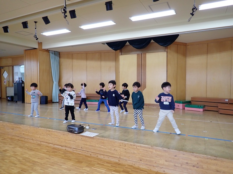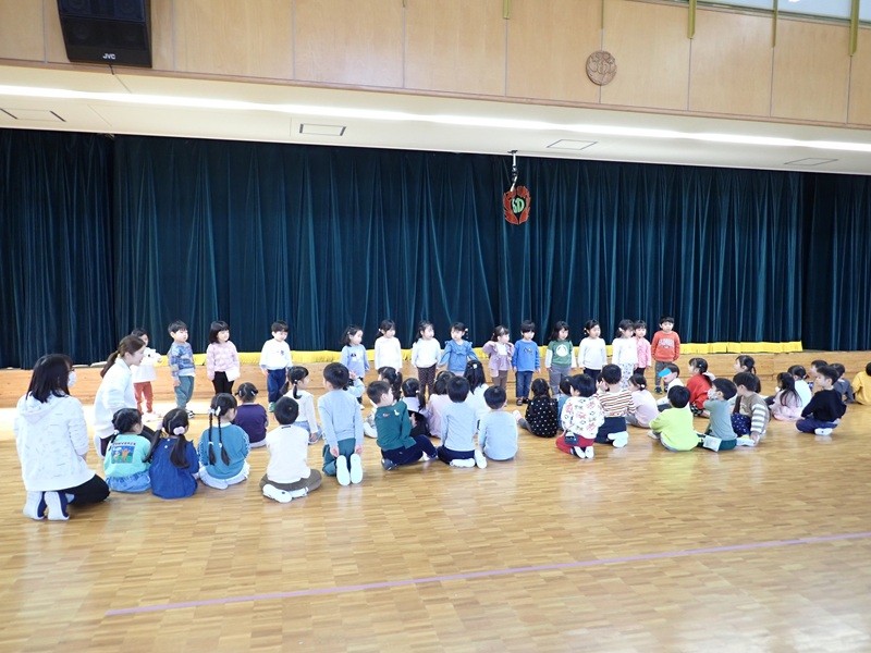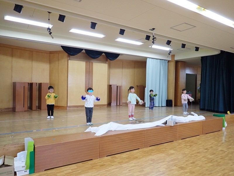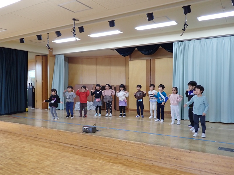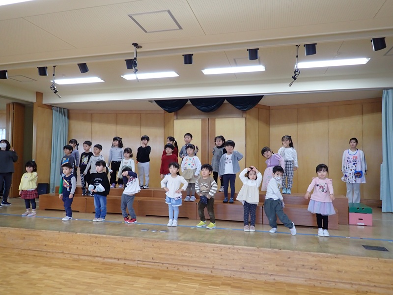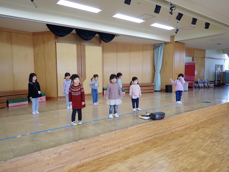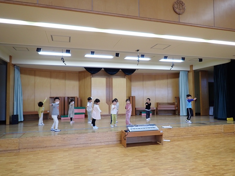 本日は、ステージで発表会の練習をしていたたんぽぽ組さんとさくら組さんの様子です。最初は、たんぽぽ組さんが遊戯の練習をしていました。