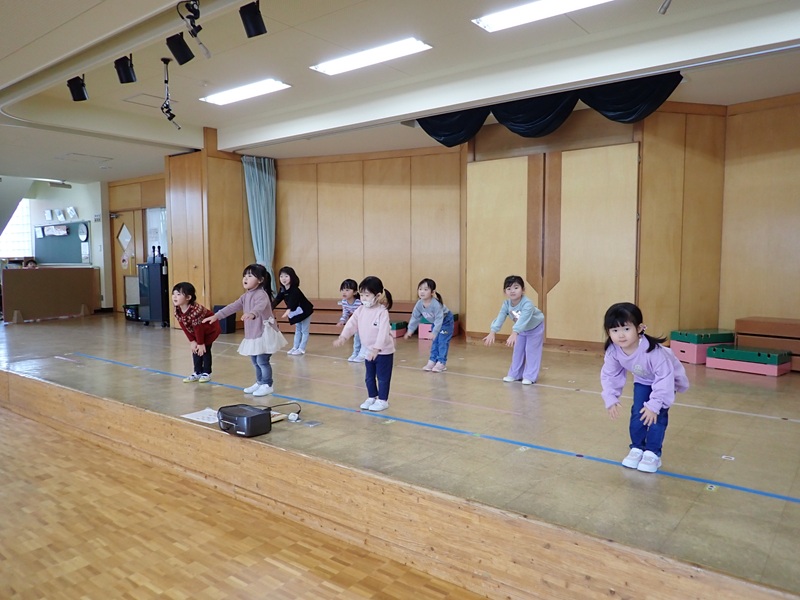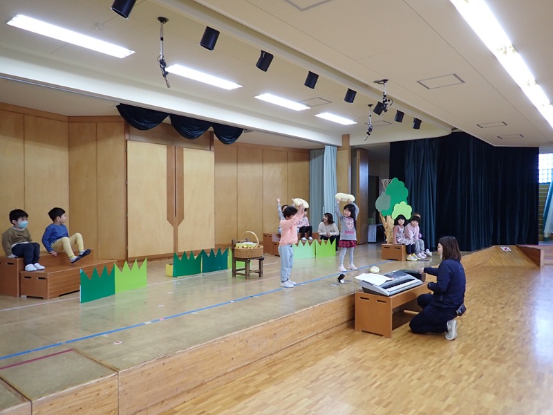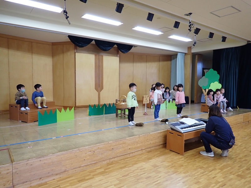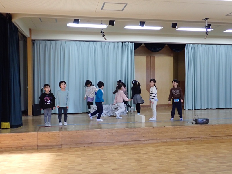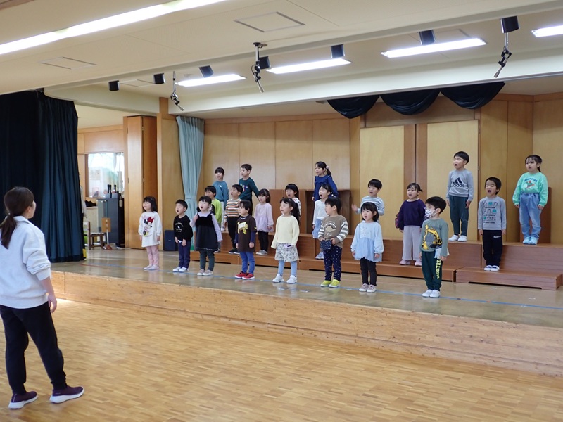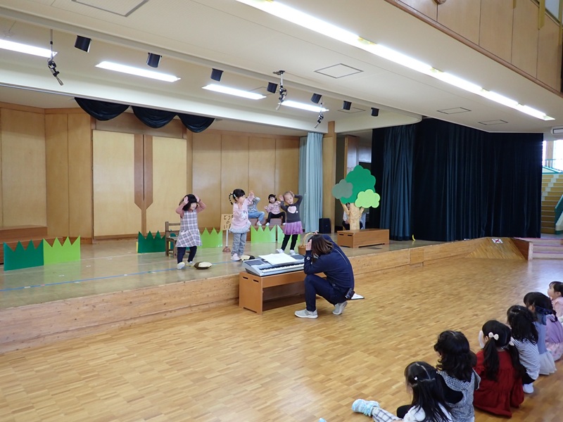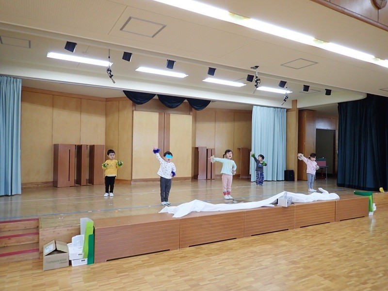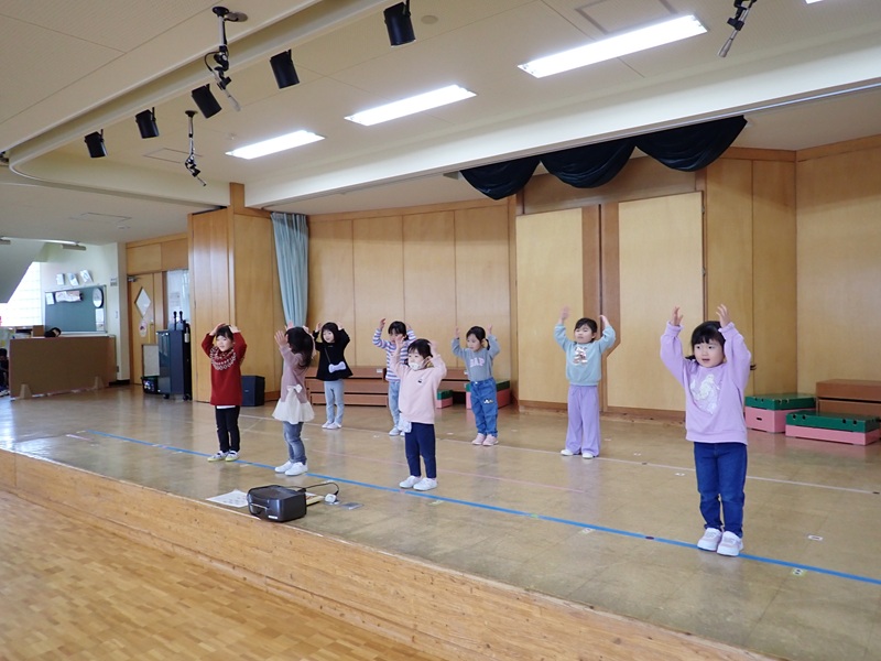 本日は、ステージで発表会の練習をしていたたんぽぽ組さんとさくら組さんの様子です。最初は、たんぽぽ組さんが遊戯の練習をしていました。