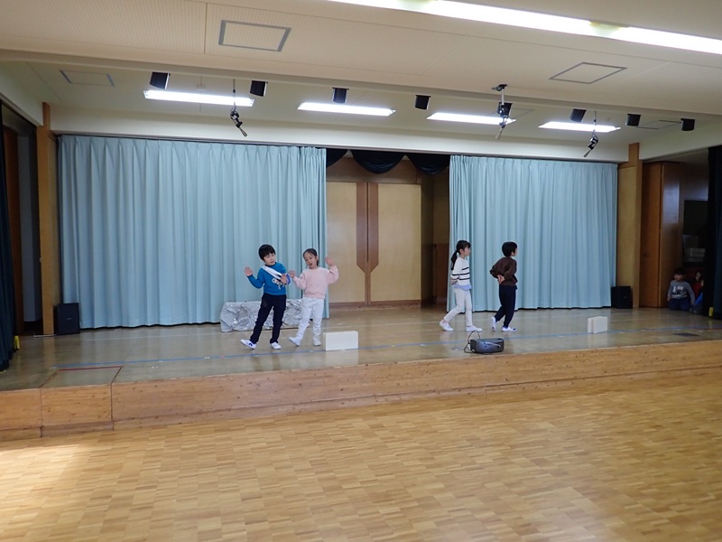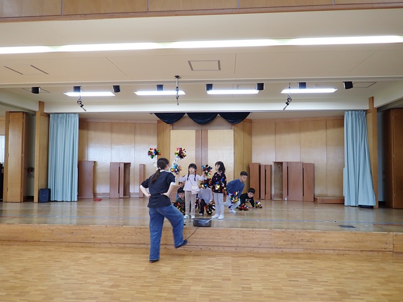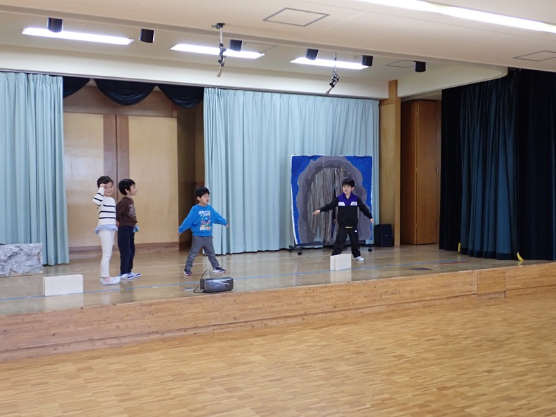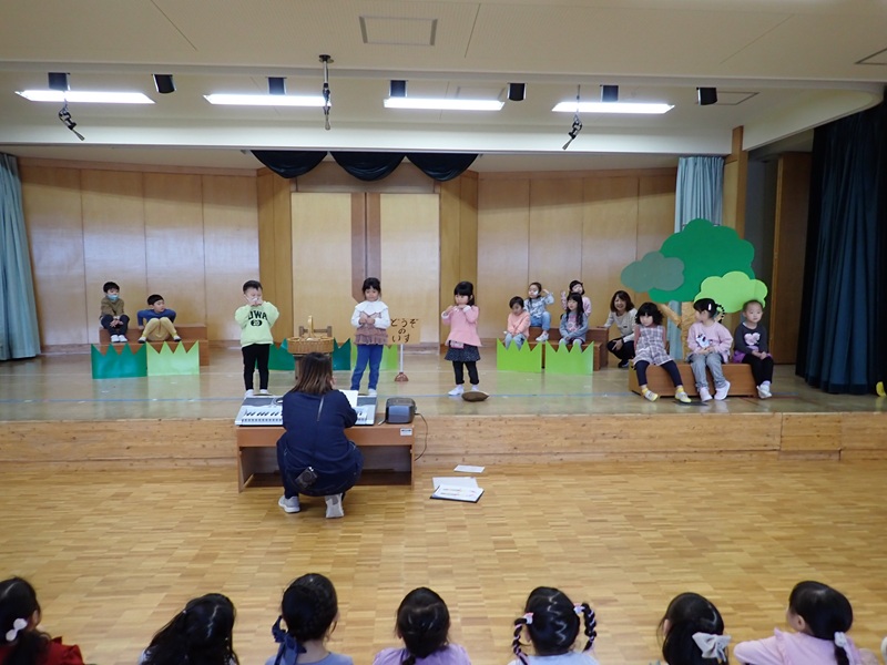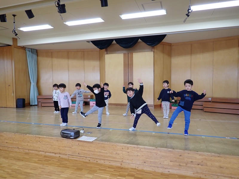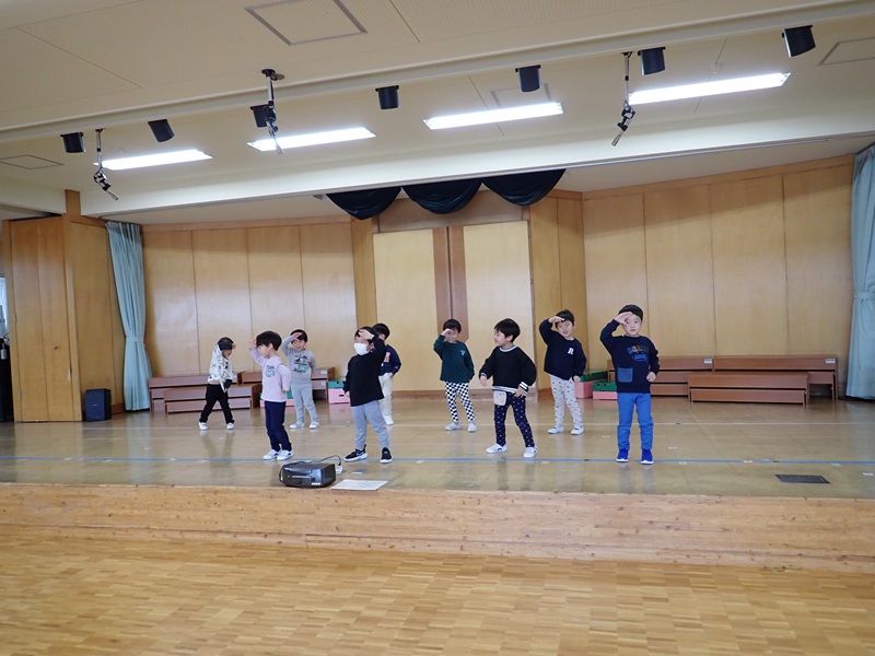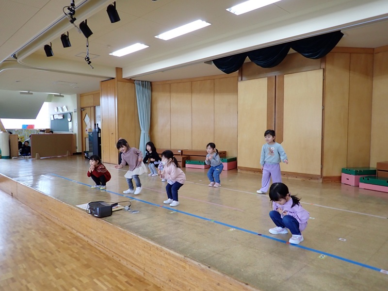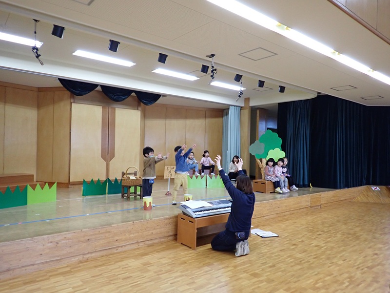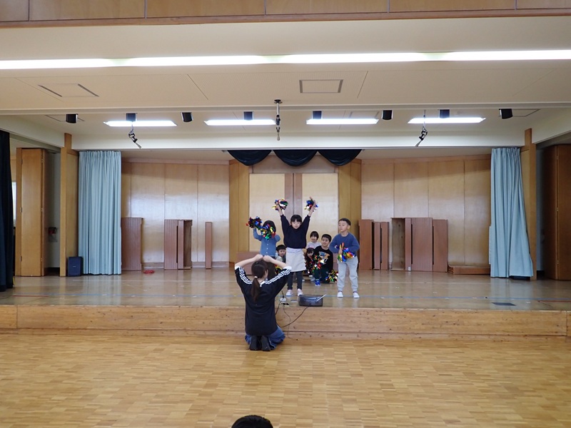 本日は、ステージで発表会の練習をしていたたんぽぽ組さんとさくら組さんの様子です。最初は、たんぽぽ組さんが遊戯の練習をしていました。