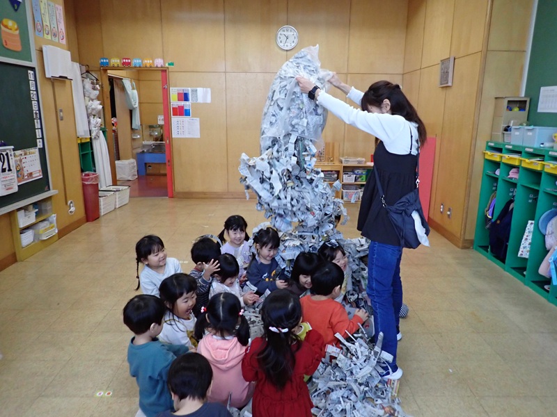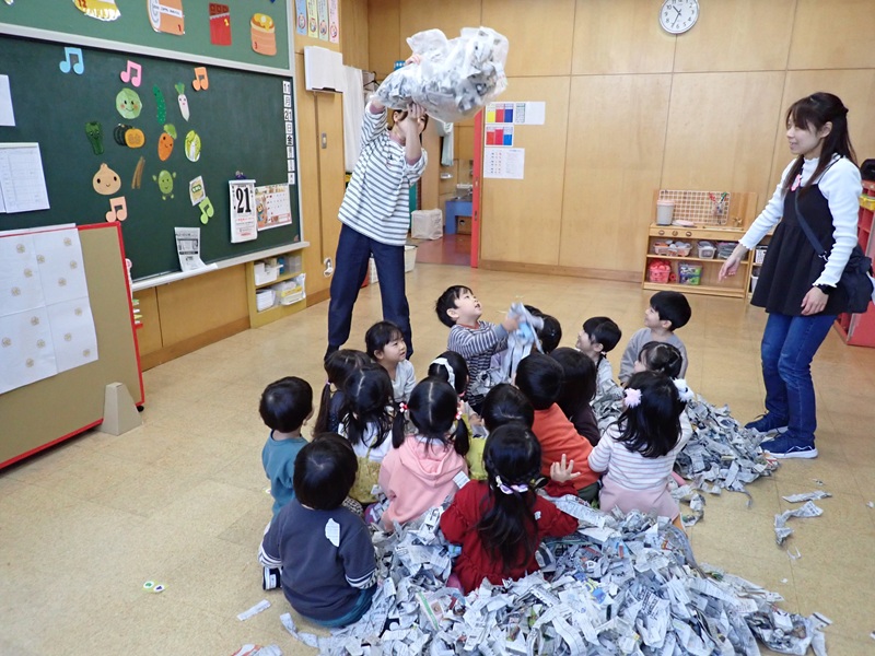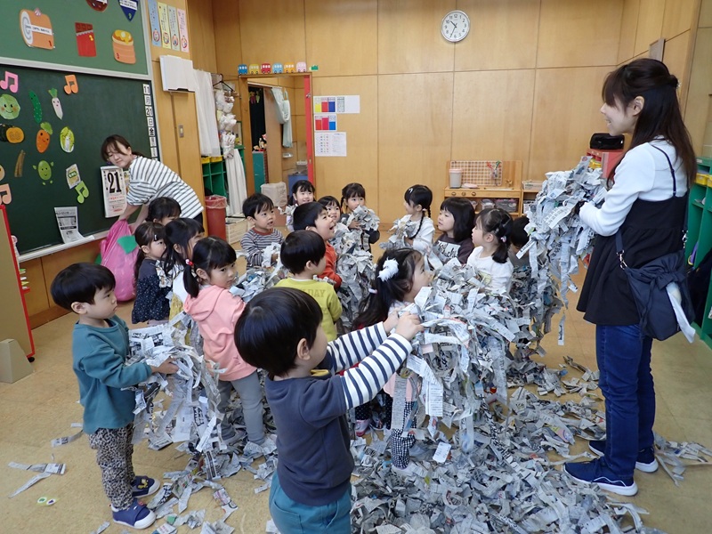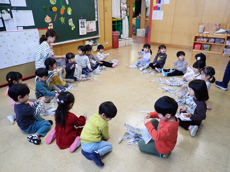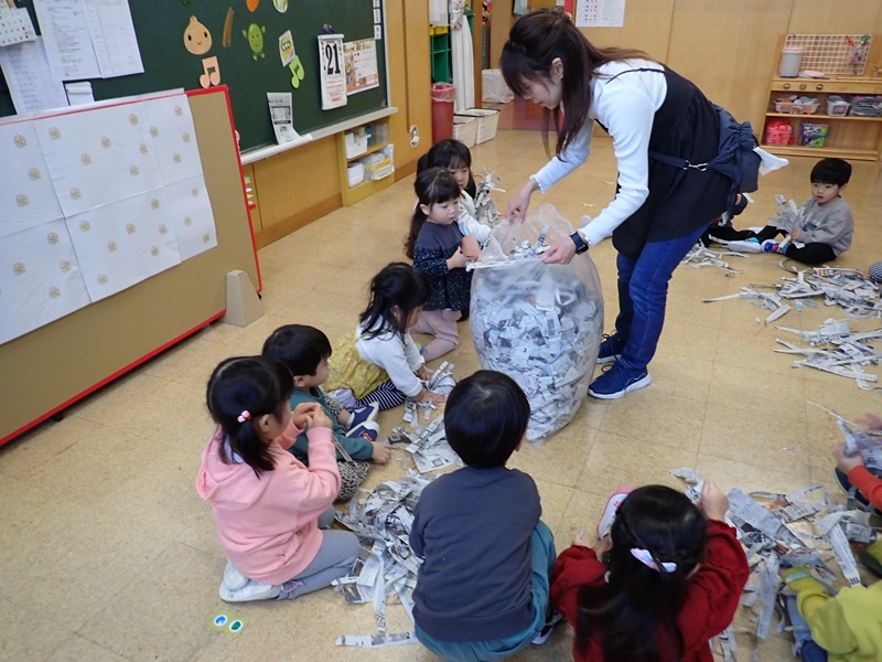 まずは、園児さんたちが新聞紙を細かくビリビリします。
