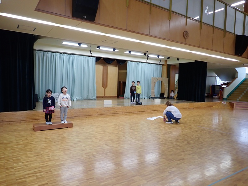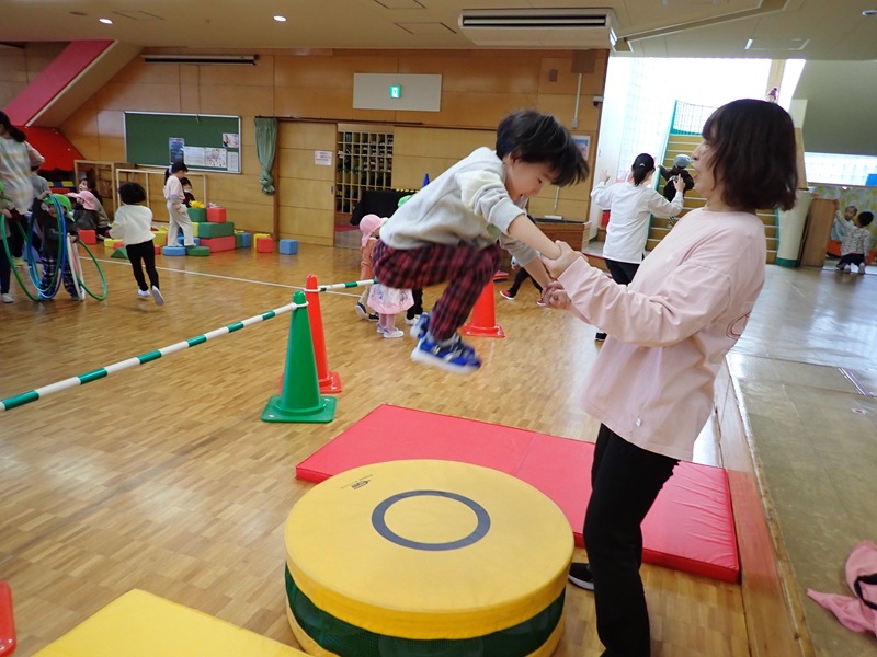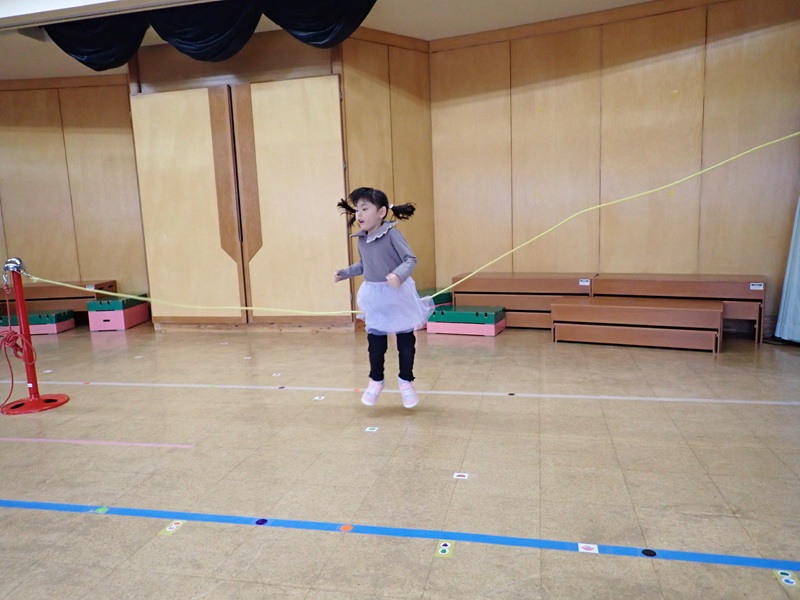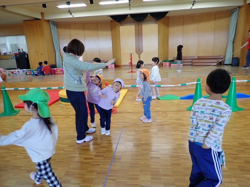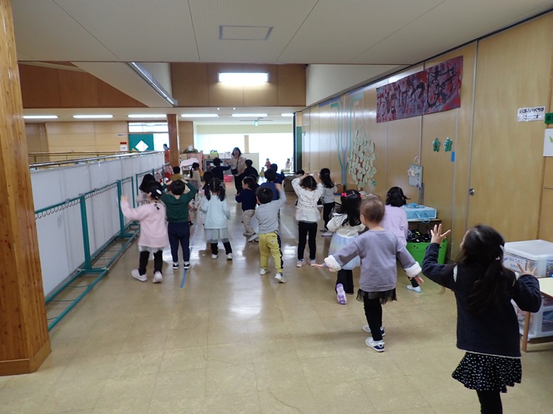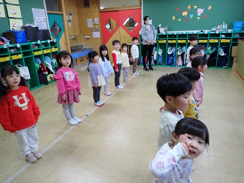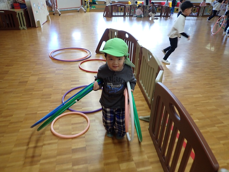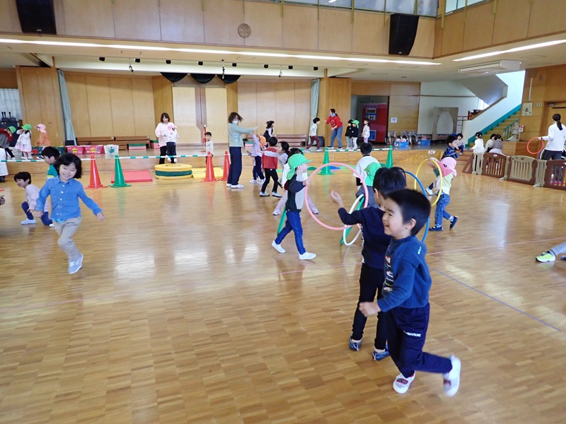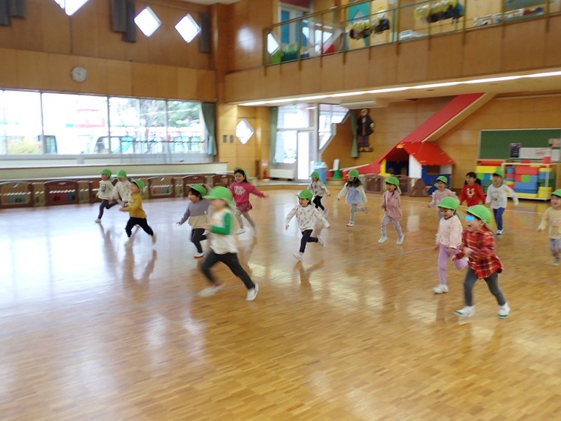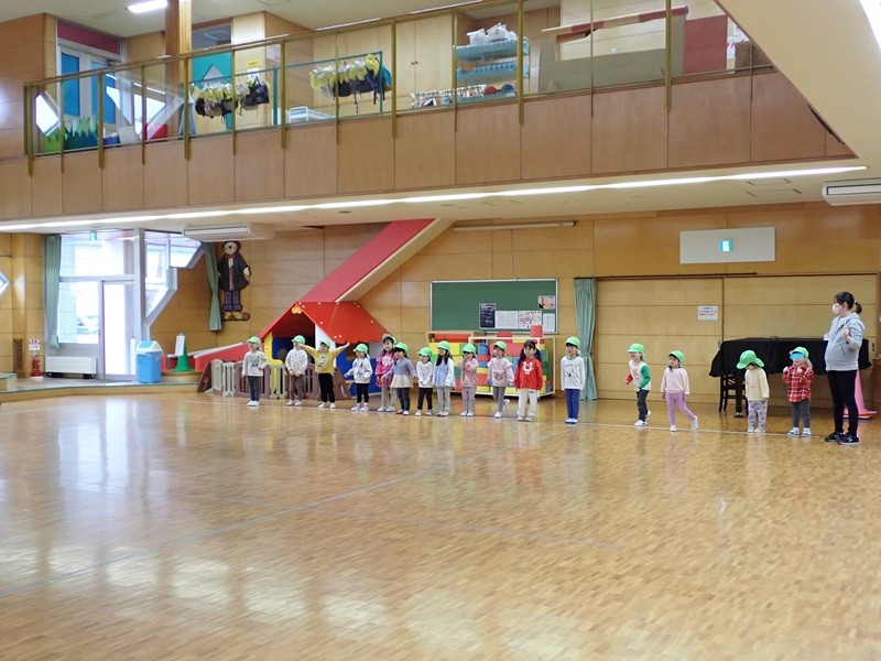 本日は、各クラスの朝の様子をお届けします。1.ホールでかりん組さんがかけっこをしていました。