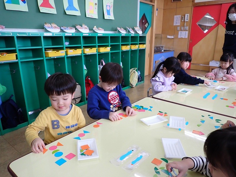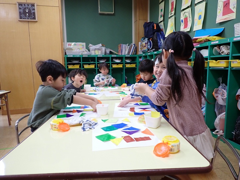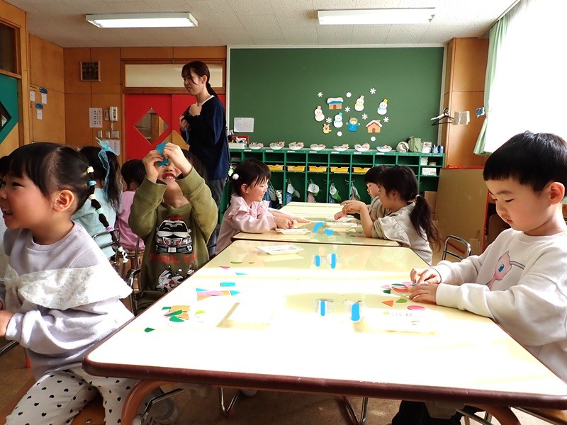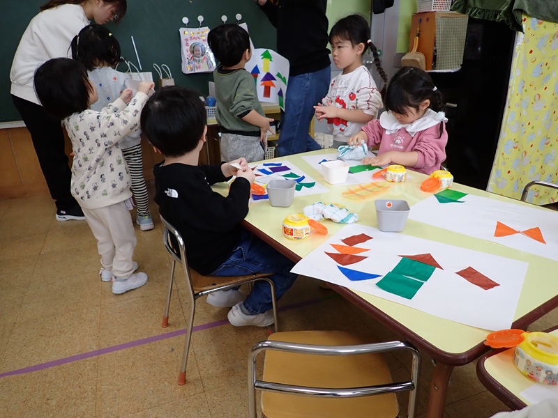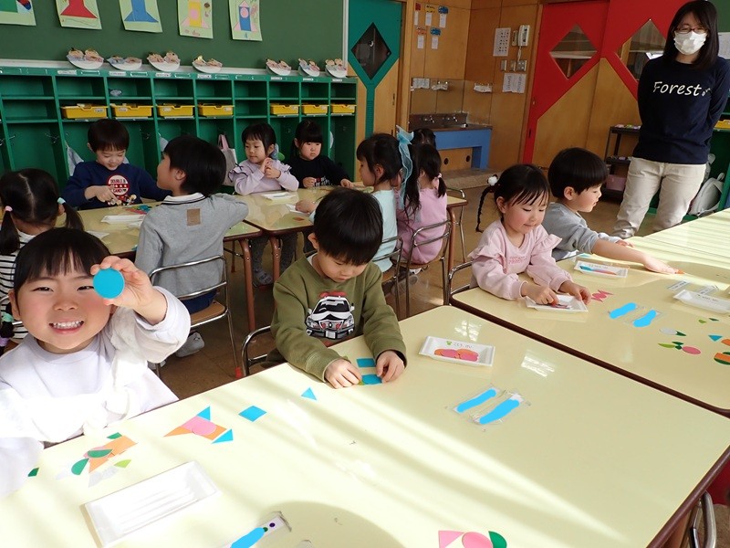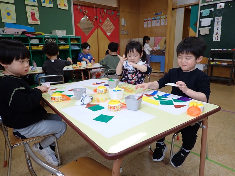 ③かりん組さんは、教室で円、三角形、四角形の色紙でいろいろな形を作っていました。