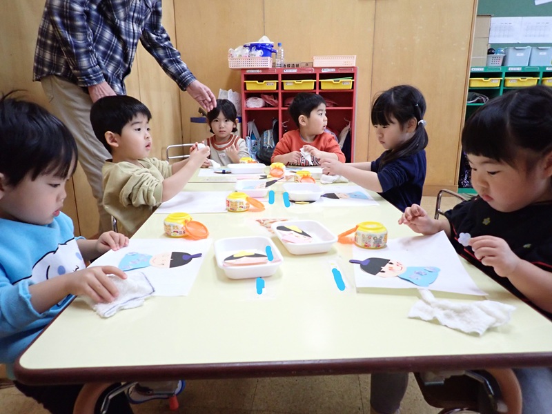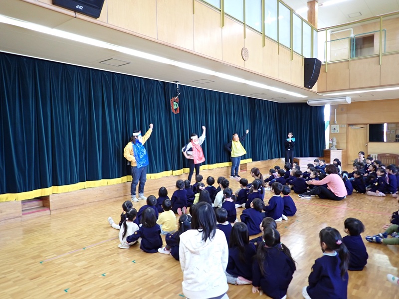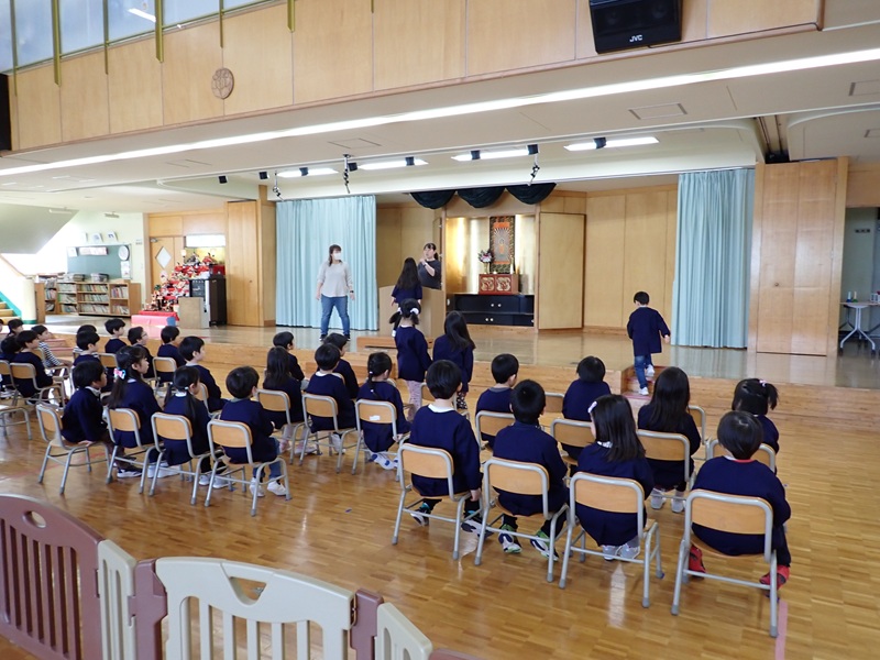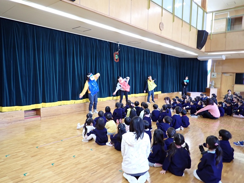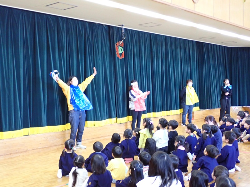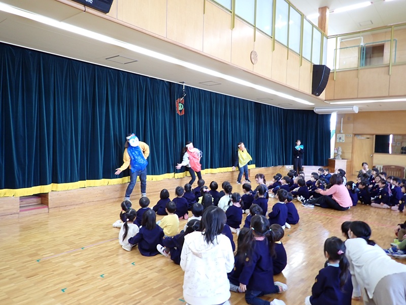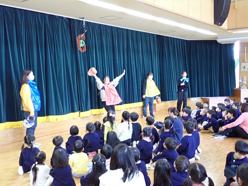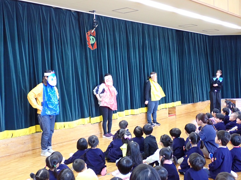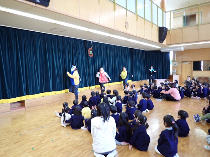 ④ここから先生たちの見せ場となりました。まずは、アンパンマン、カレーパンマン、コキンちゃんに扮した先生たちが登場!! アンパンマンの歌に合わせて踊りました。アンパンマン、カレーパンマン、コキンちゃんは、誰なのかクイズも盛り上がりました!!!