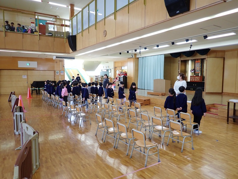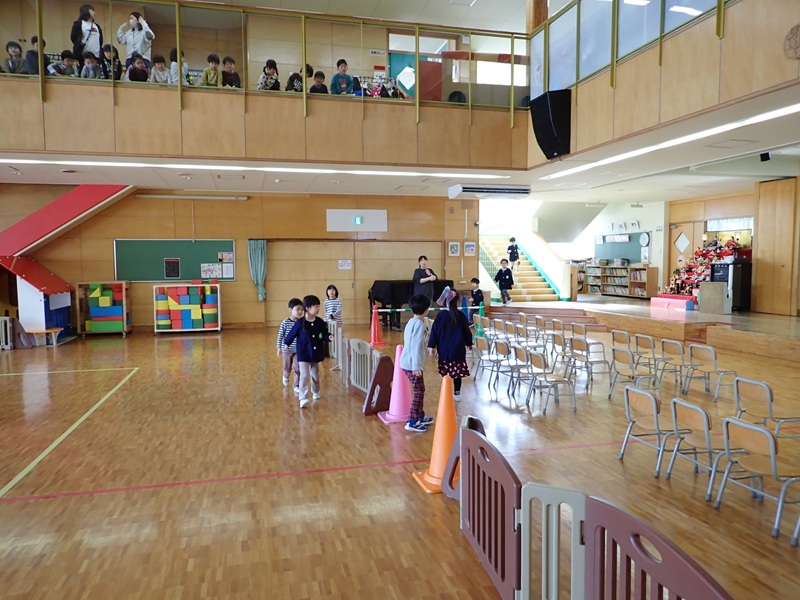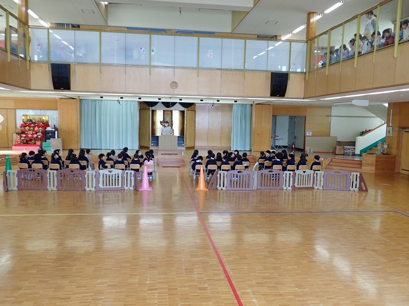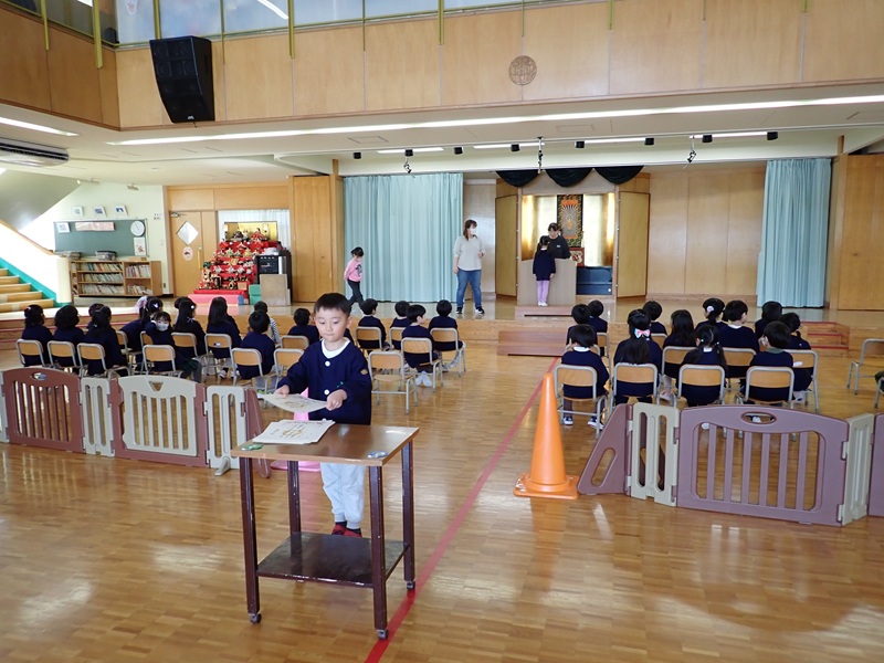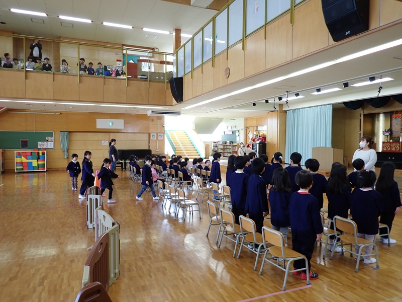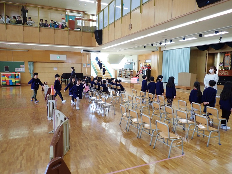 ①年長組さんは、ホールで卒園式の練習に励みました。
