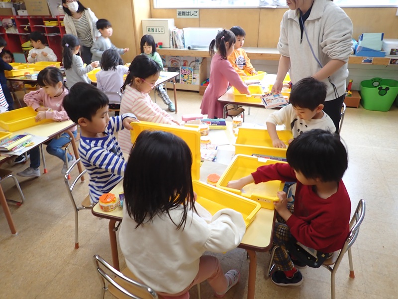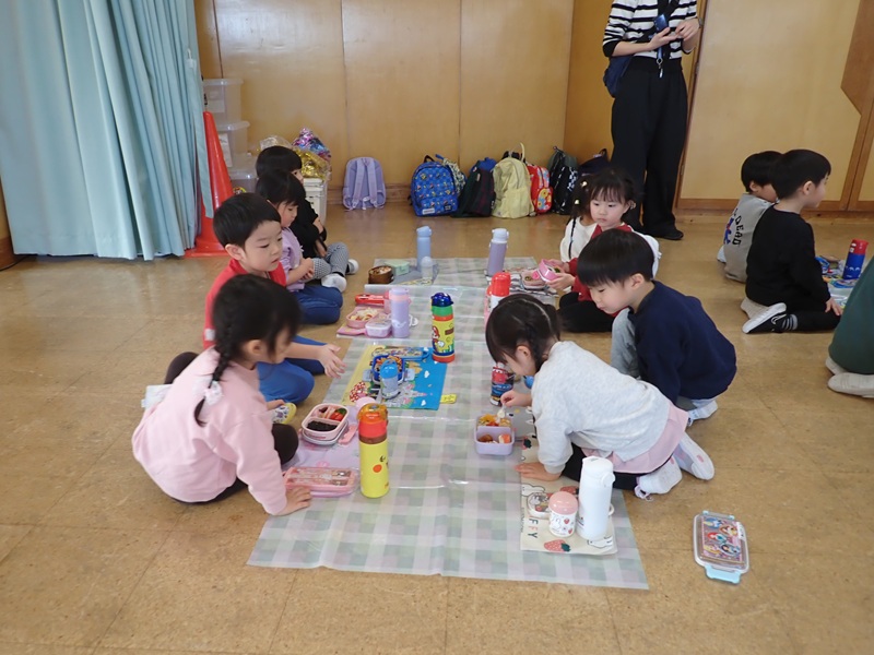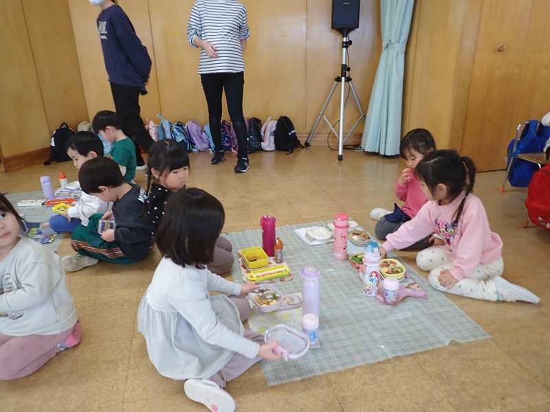 最後の6枚の写真は、年少組さんが遠足ごっこでステージで給食・弁当を食べたものです。