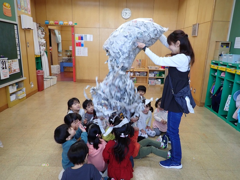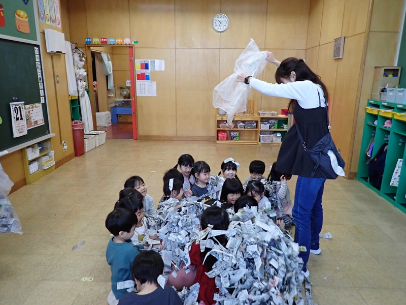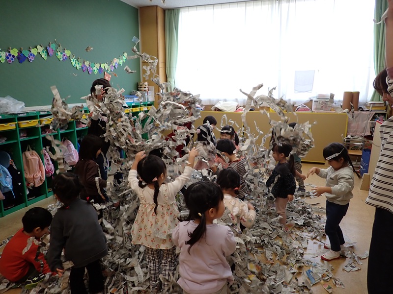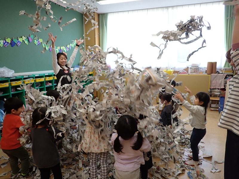 いっぱいになった細かな新聞紙を園児さんたちの上からばらまきます。そして、みんなでそのばらまいた細かな新聞紙を上に放り投げます。