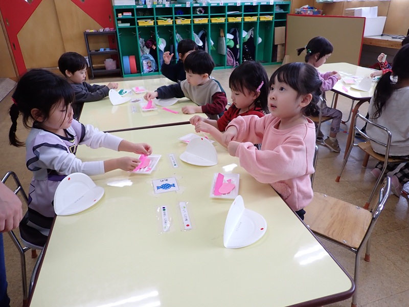 うさぎさんとかえるさんの2種類あるので、どちらにするか選んで、紙皿とペットボトルのキャップと折り紙でカスタネットを作りました。